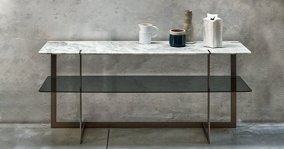 Its two glass and marble are able to establish a dialogue in a stylistic continuum that finds its maximum essence in the final elegance, so they enrich the most sober environments and dampen the richest ones. The marble on the upper top, which is reflected in the glass shelf below, gives life to ever-changing designs that change with the light, becoming a work of contemporary art.