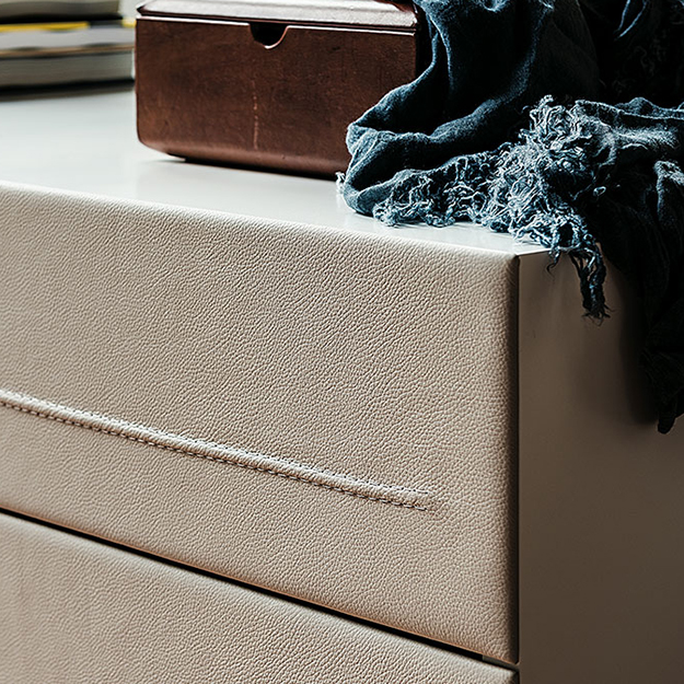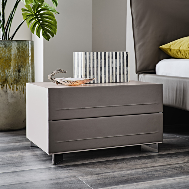 The Dyno Bedside Table is an elegant design with two drawers and a wood frame available in a choice of finishes. The drawer fronts upholstered in a range of synthetic leather or soft leathers, feature horizontal stitching detail. The bedside table is supported by angled stainless steel feet.