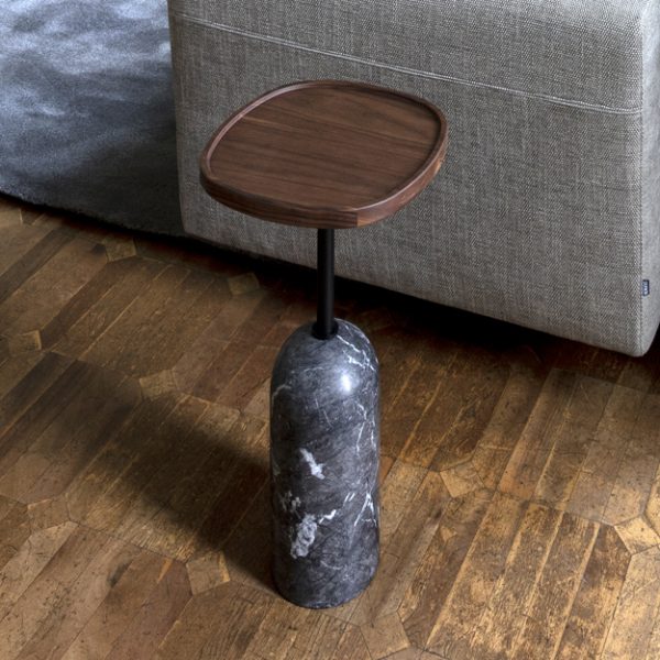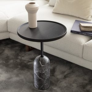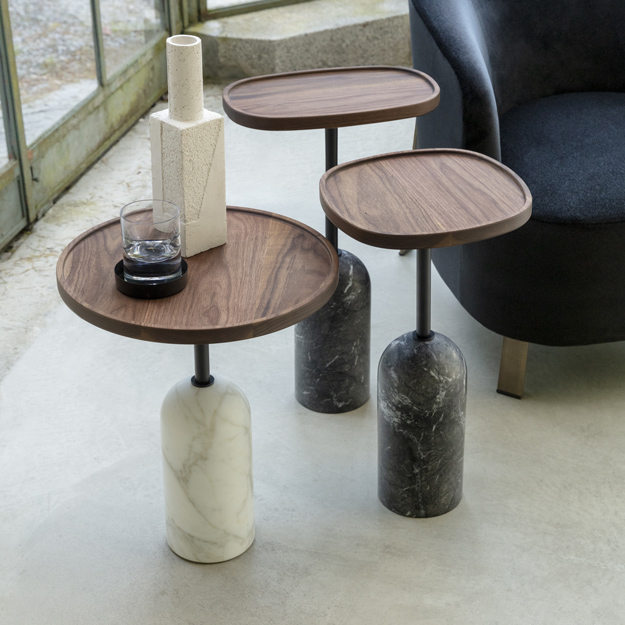 The top comes in round, square, and oval shapes and can be customised in a variety of finishes. The base is available in a choice of sleek matt marble finishes, with a matt black metal stem.