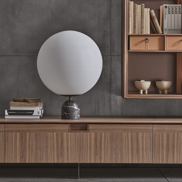 The Porada Ekero lamp is a refined dimmable table lamp with a spherical white opal frosted glass diffuser and integrated LED light. This is complemented by a cylindrical marble base and a central stem in grey pewter metal.