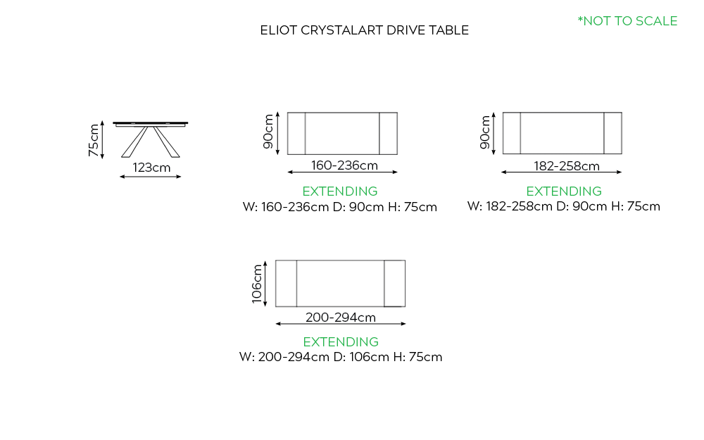 | Size | Extending – W: 160-236cm D: 90cm H: 75cm, Extending – W: 182-258cm D: 90cm H: 75cm, Extending – W: 200-294cm D: 106cm H: 75cm |