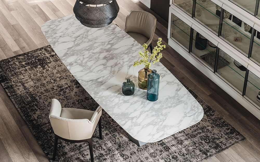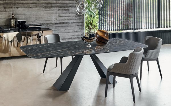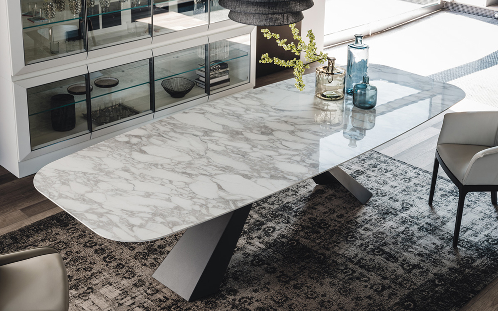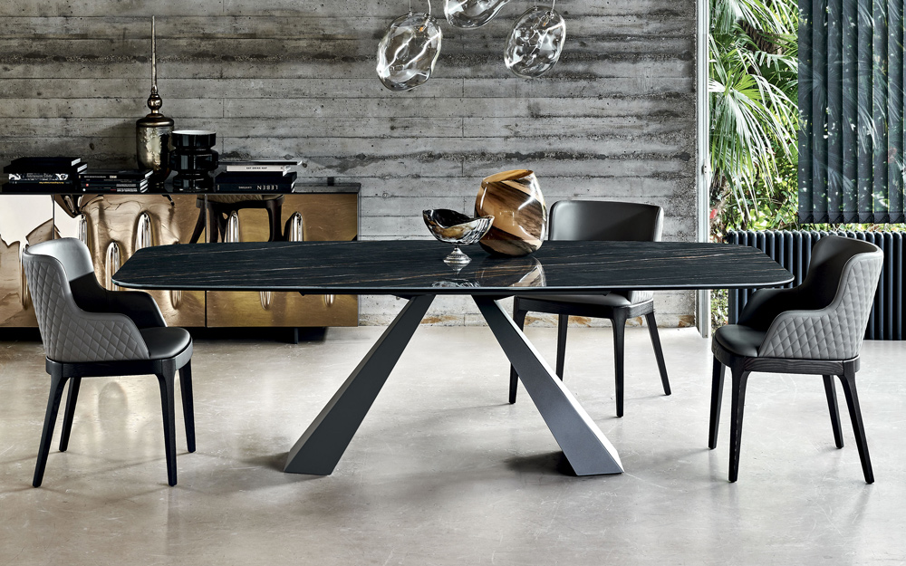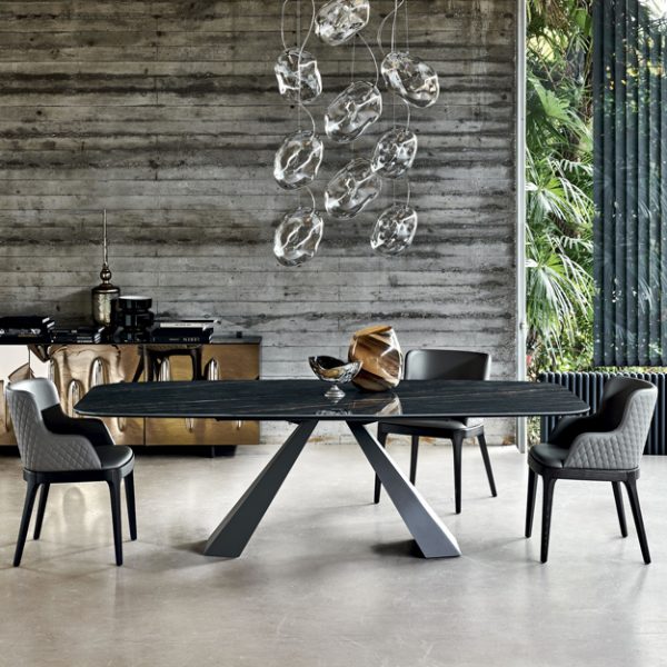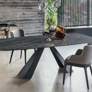The Cattelan Italia Eliot is a striking table with an elegantly simple base in a selection of embossed lacquered steel finishes. The table top is available in a variety of ceramic finishes backed on smoked grey glass.