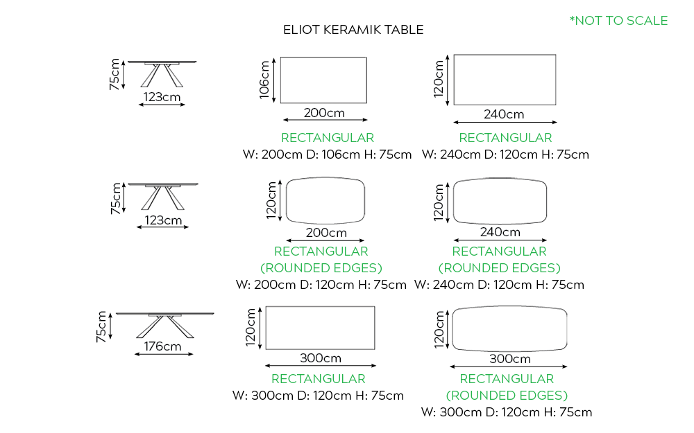 Size | Rectangular – W: 200cm D: 106cm H: 75cm, Rectangular – W: 240cm D: 120cm H: 75cm, Rectangular – W: 300cm D: 120cm H: 75cm, Rectangular (Rounded Edges) – W: 200cm D: 120cm H: 75cm, Rectangular (Rounded Edges) – W: 240cm D: 120cm H: 75cm, Rectangular (Rounded Edges) – W: 300cm D: 120cm H: 75cm |