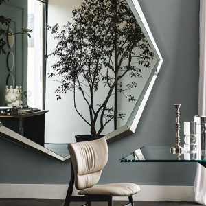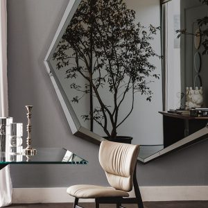 The Emerald Magnum wall mirror is a statement piece with its sharp angular frame in an octagonal shape. Its entire frame is made in mirrored glass for a high-end, contemporary finish.