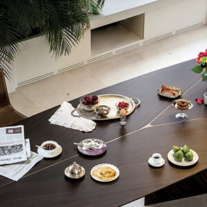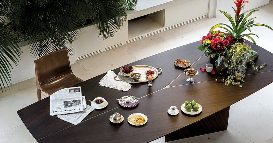 The base stands tall and strong, both in design and function whilst the top is enriched by a play of metal and wood, carving and cutting through the surface following the base setup. The materials equally showcase what is achievable with moka oak or sucupira contrasting with micaceous brown, oxy grey, brass or titanium in metal design.