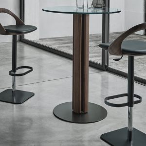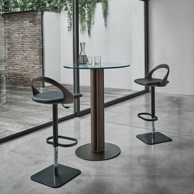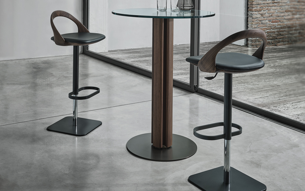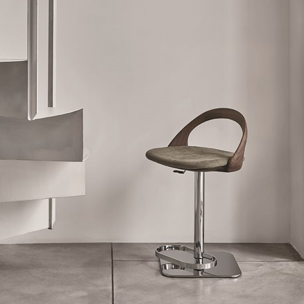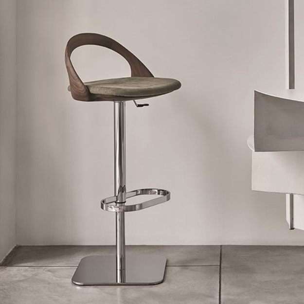 The Ester Bar Stool is a stylish adjustable-height gaslift design featuring a striking curved seat with a cut-out backrest for added detail, complemented by a matt black or chrome metal base with an oblong footrest and a square floor-plate.