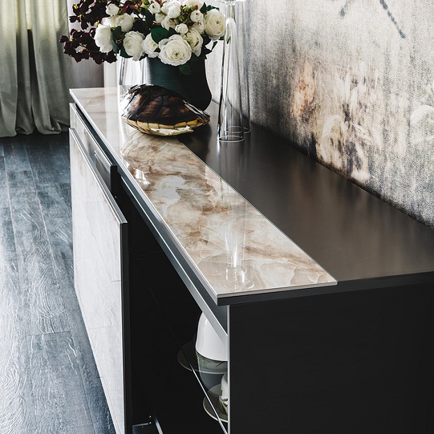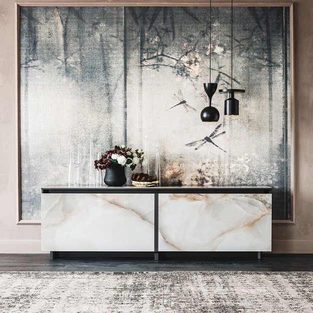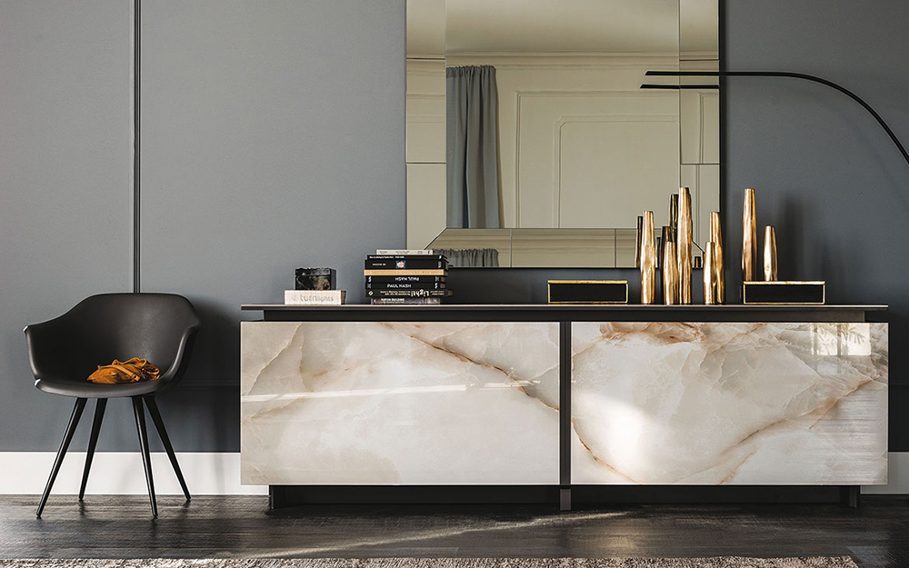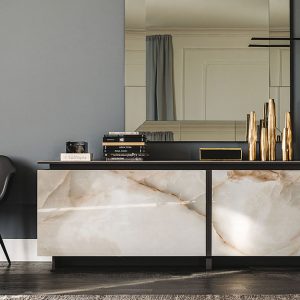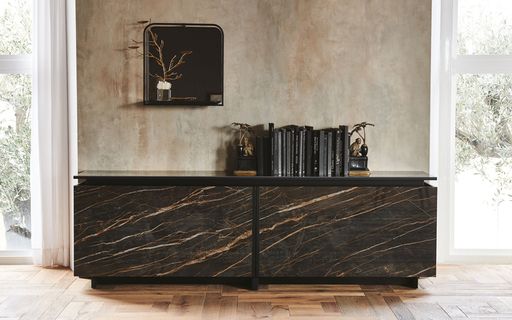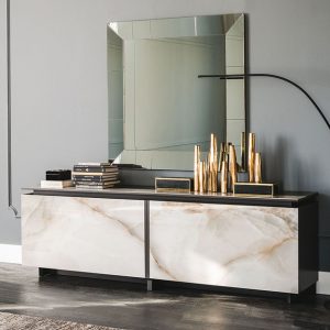 The Europa Keramik is a sophisticated sideboard from Cattelan Italia. Complete with two ceramic sliding doors and a matching insert on the top available in a selection of stylish ceramic finishes. The main frame is in a complementing matt graphite lacquered wood with transparent clear glass internal shelves.