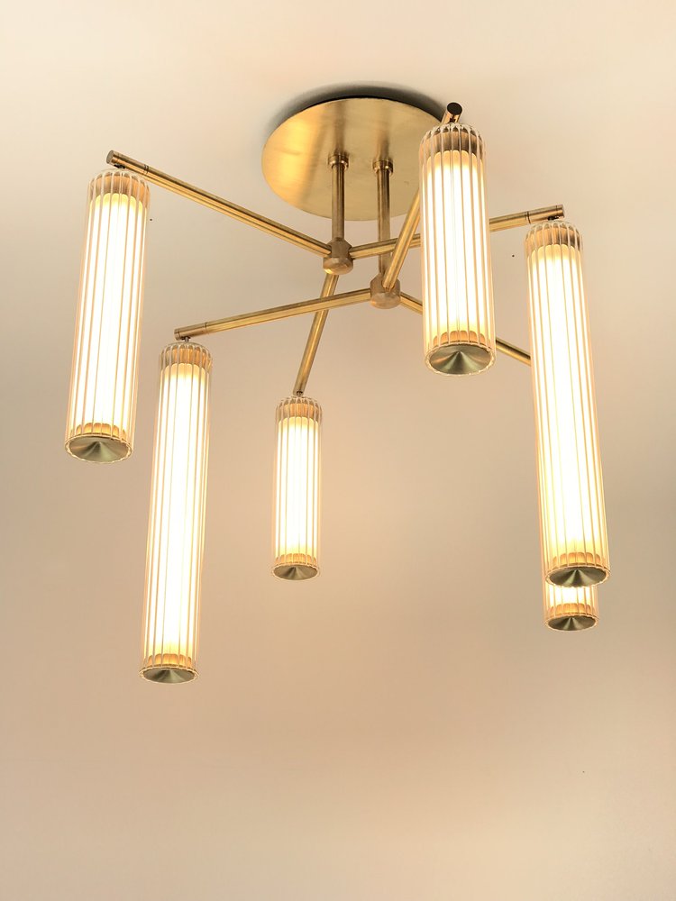 The Fresnel Chandelier is composed of three shades of varying lengths (400mm, 500mm & 600mm). Assembled together with precision engineered brass arms and a central ceiling mount.