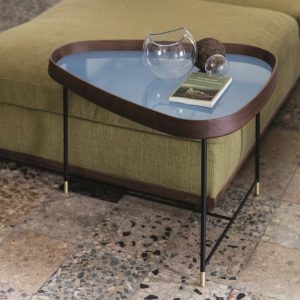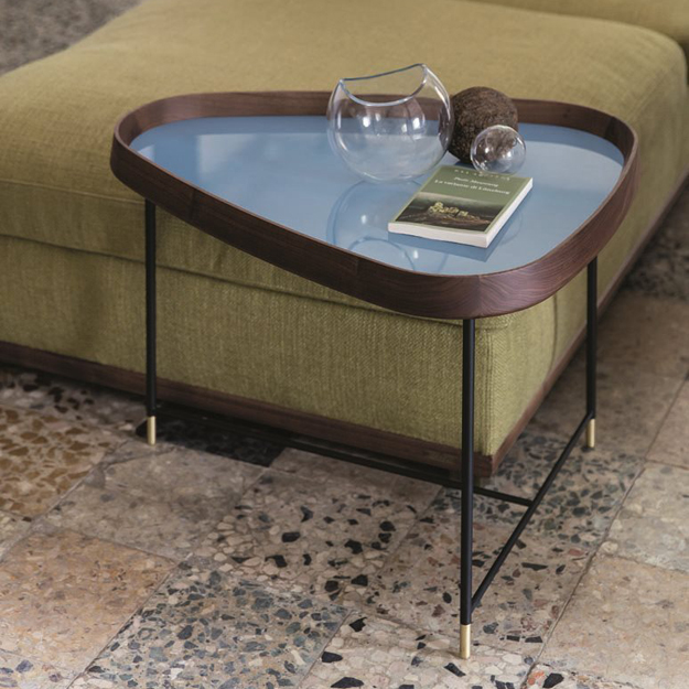The Fritz collection offers a striking range of vibrant side tables with varying shaped tops. The table is composed of a matt black metal base with brushed brass feet, the top features a frame in solid Canaletto Walnut with the option to customise the top inlay with a matching wood or shiny lacquered colours.