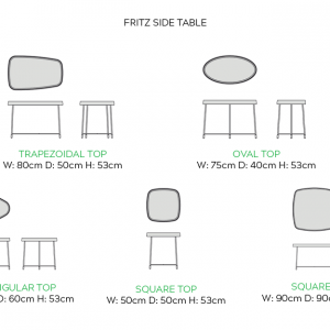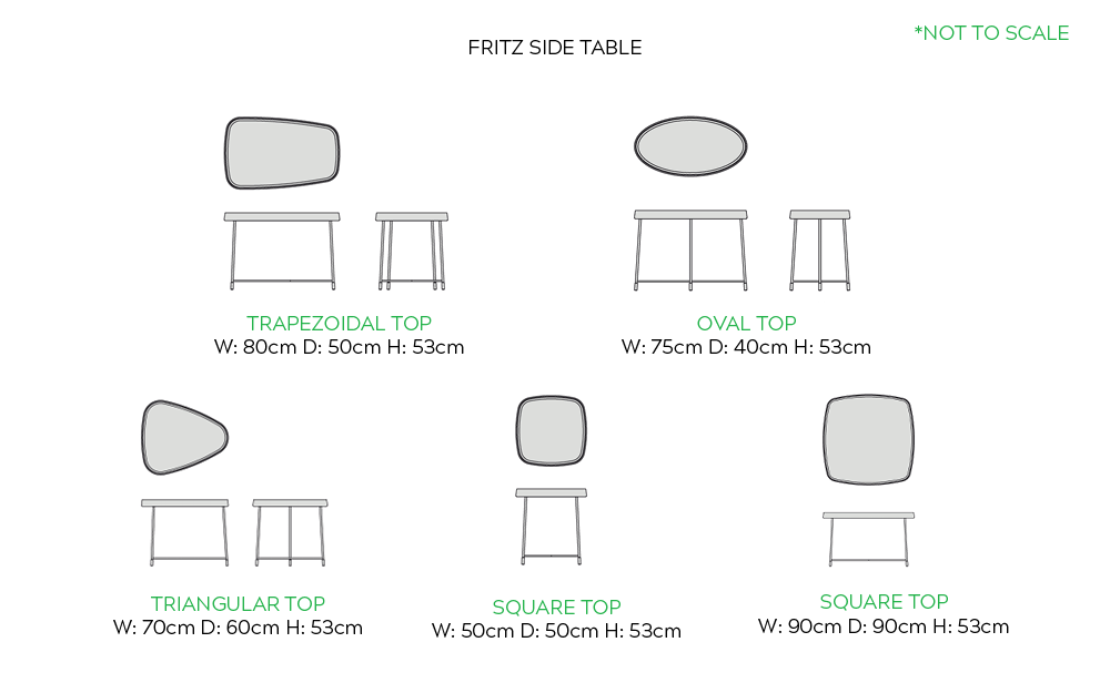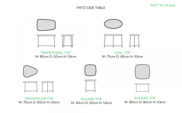 Size | Oval Top – W: 75cm D: 40cm H: 53cm, Square Top – W: 50cm D: 50cm H: 53cm, Square Top – W: 90cm D: 90cm H: 53cm, Trapezoidal Top – W: 80cm D: 50cm H: 53cm, Triangular Top – W: 70cm D: 60cm H: 53cm |