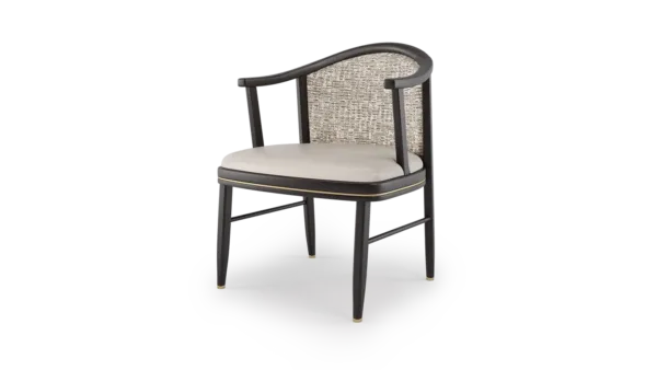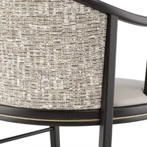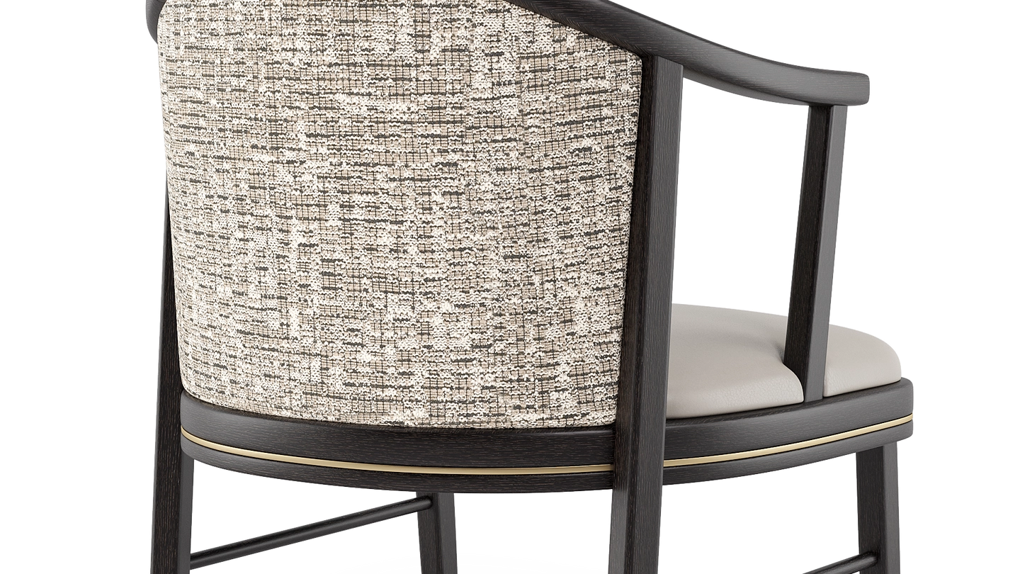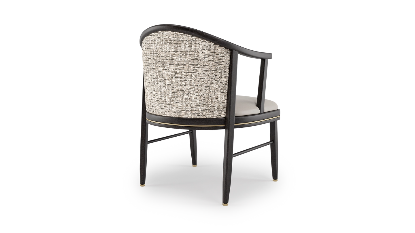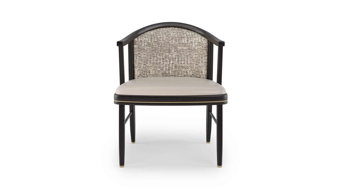 The first thing you notice about the stunning FUJI dining armchair is its free-flowing silhouette, which is dramatically outlined in dark solid wood. This flawlessly frames subtly different upholstery fabrics while accents of slimline brushed brass complete the look.