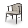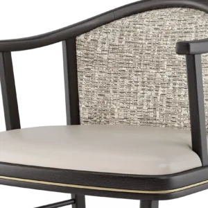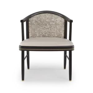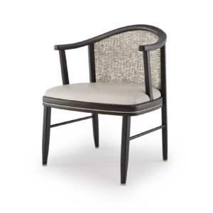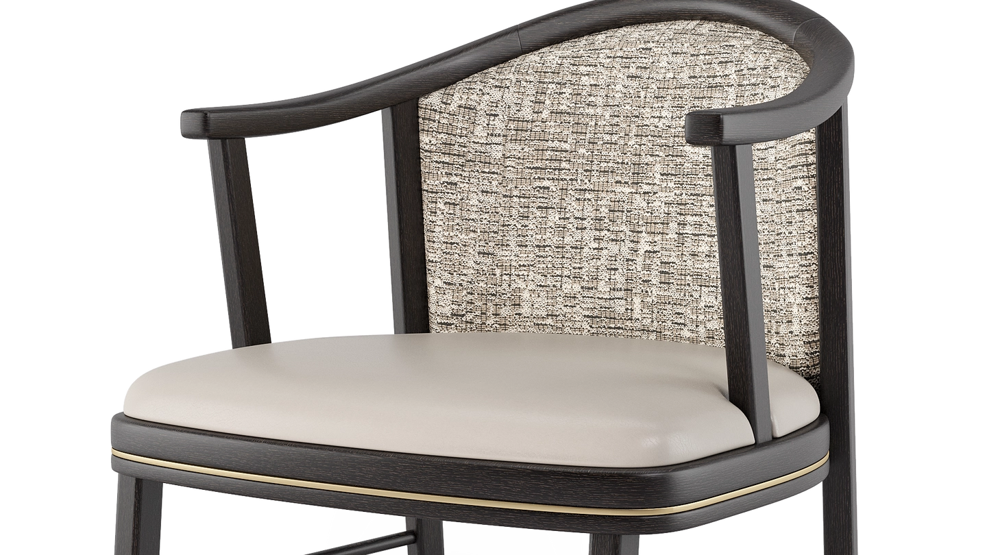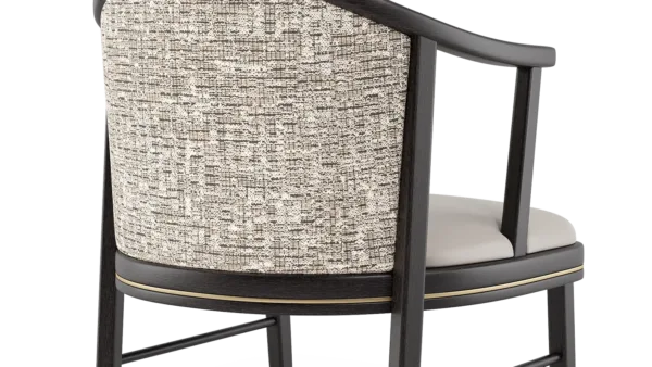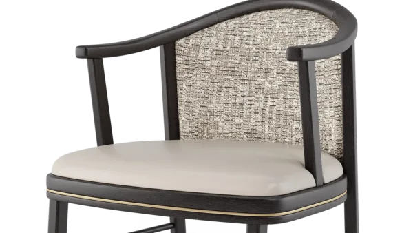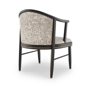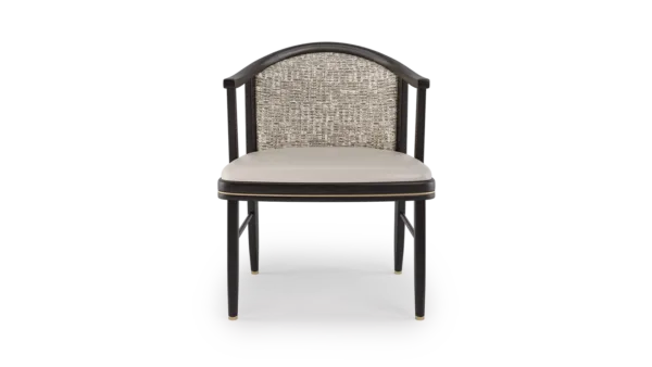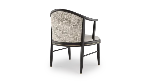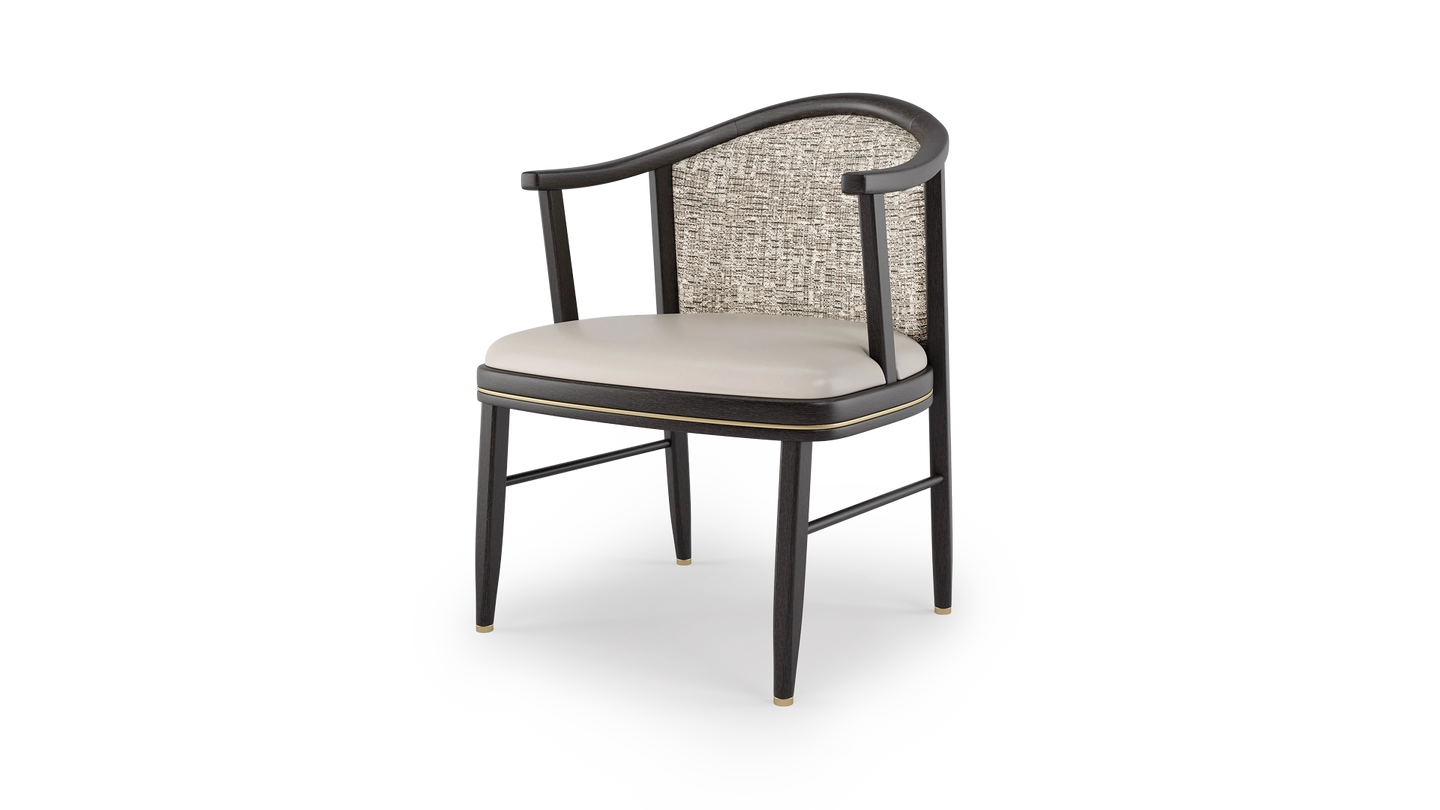 The first thing you notice about the stunning FUJI dining armchair is its free-flowing silhouette, which is dramatically outlined in dark solid wood. This flawlessly frames subtly different upholstery fabrics while accents of slimline brushed brass complete the look.