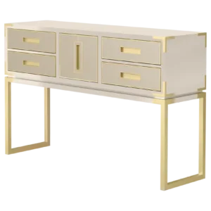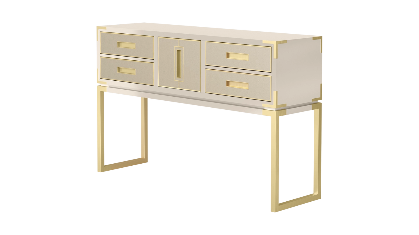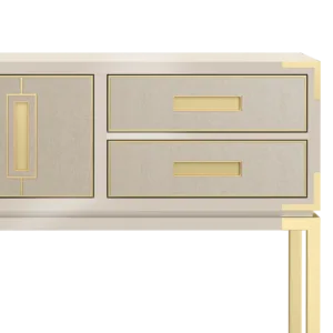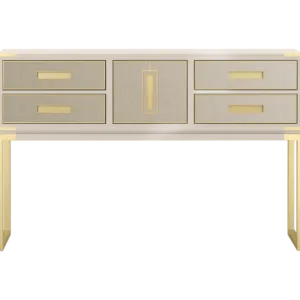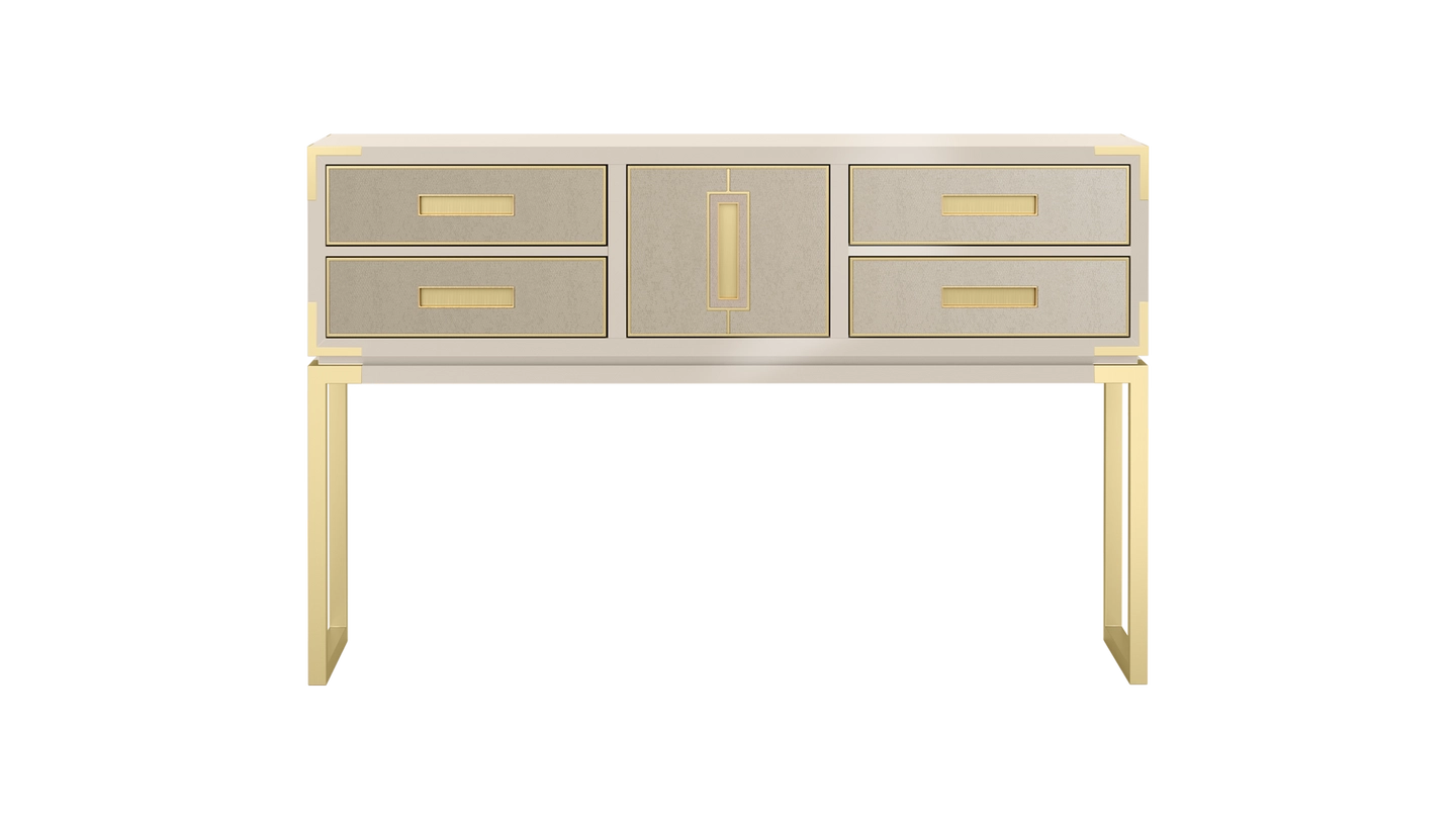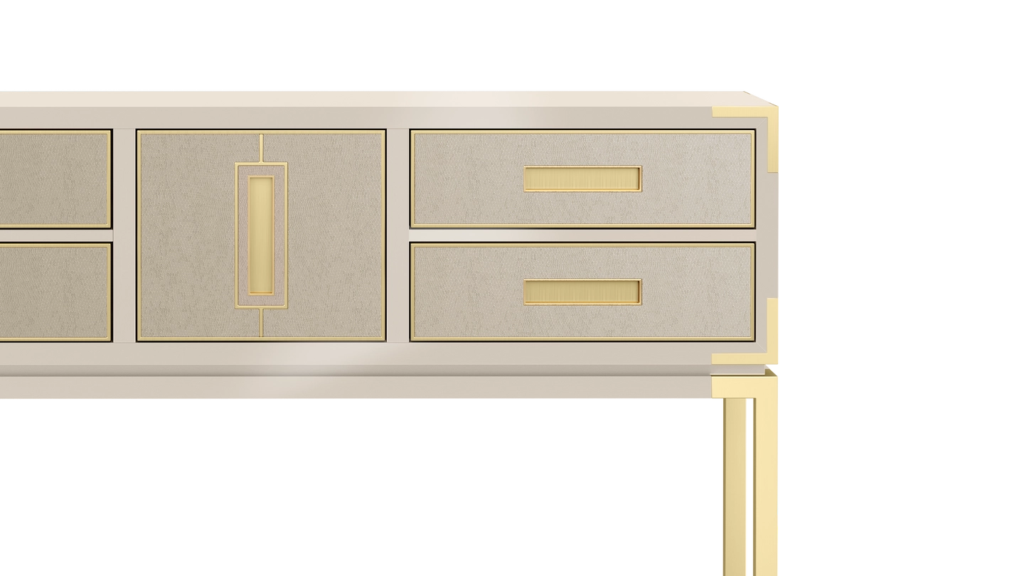Designed to be admired, the GARDNER console’s rectangular storage box is reminiscent of a vintage carriage trunk. Featuring five leather-fronted drawers with inset handles, it’s crafted from glossy lacquered wood and sits on a base of brushed brass.