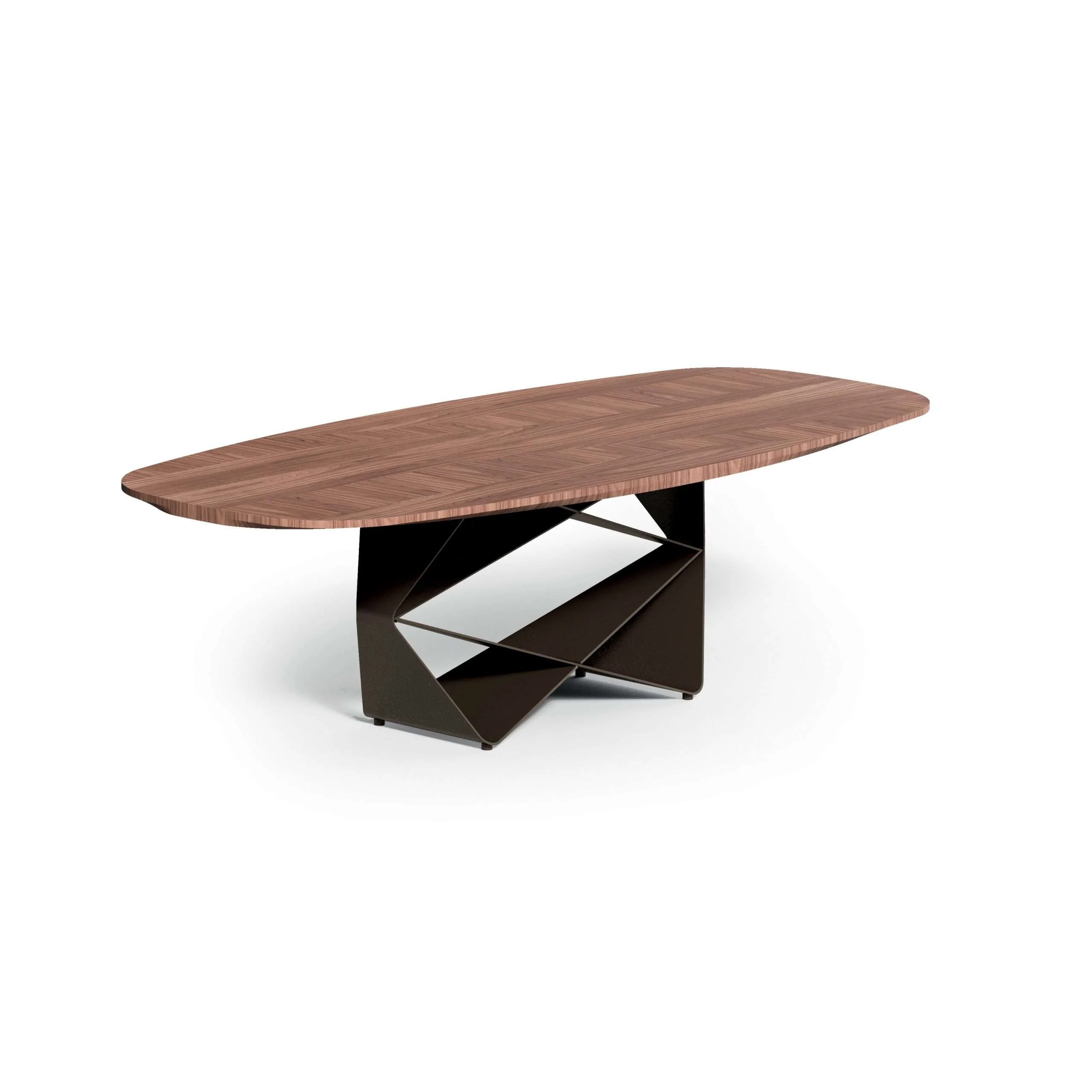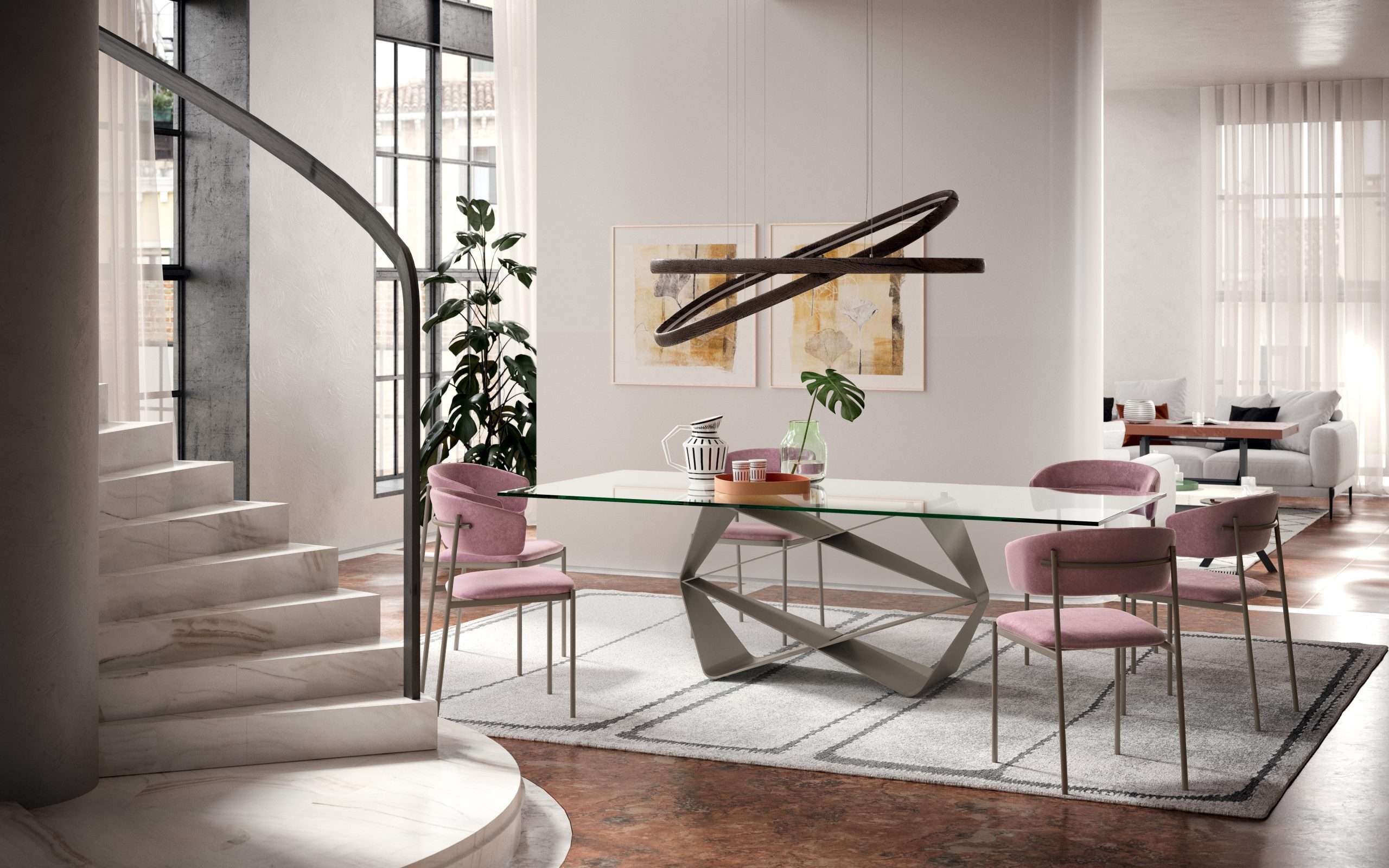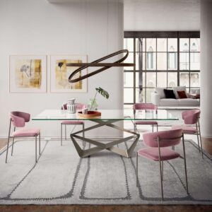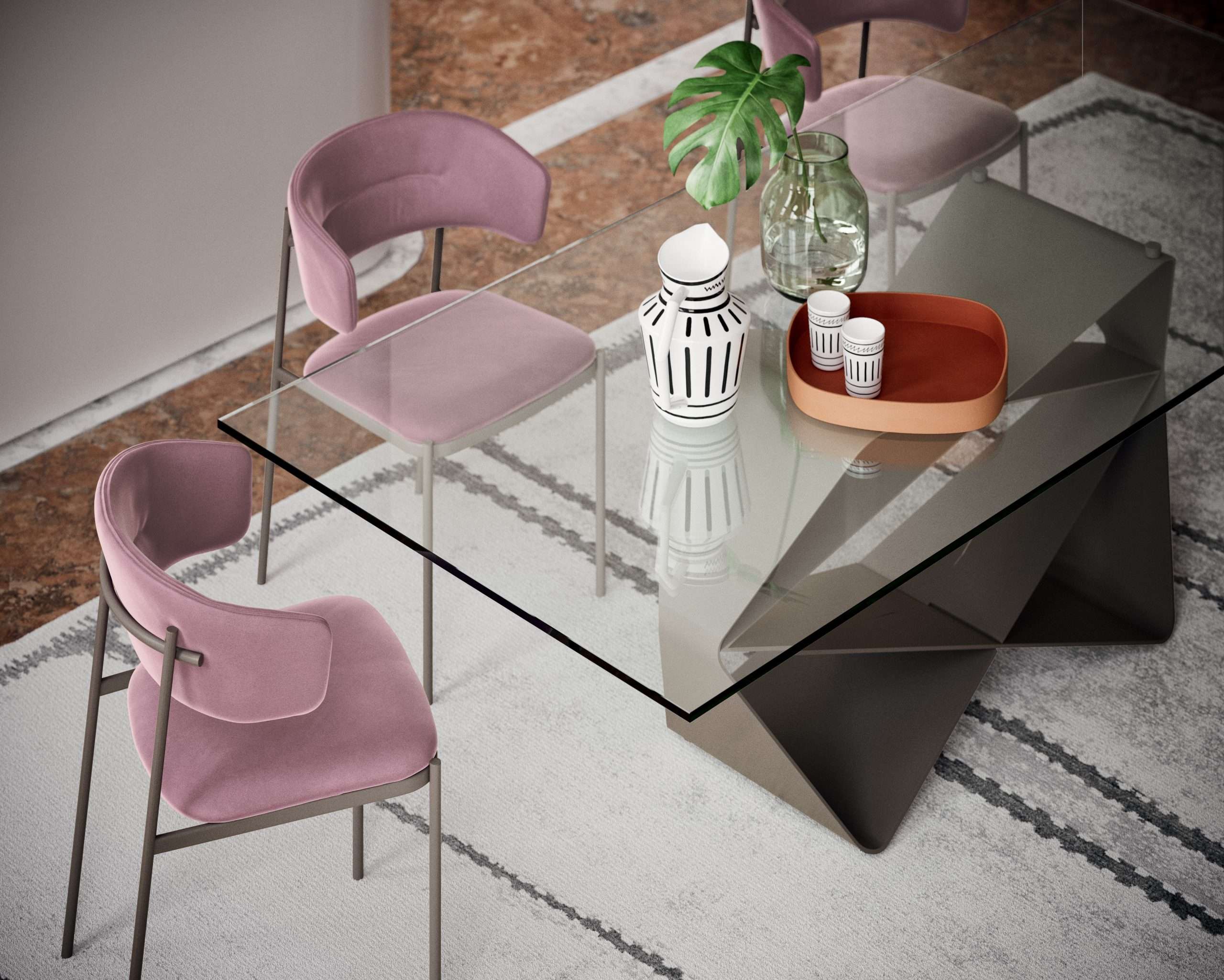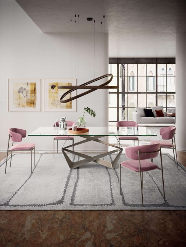 The simplicity of the different glass tops of the Gem table, with a double shaped beveled cross grinding edge and a straight ground polished edge, highlight the essential dynamism of the metal base in a double chromatic nuance or single color. The powerful geometric interlocking of the metal base attracts the attention of the living and gives this furniture a unique personality.