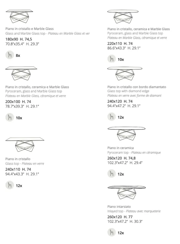 Top Finishing | Coloured Glass Float, Glass Bronze, Marble Glass Calacatta gold lucido, Marble Glass Onice, Marble Glass Sahara Noir, Marble Glass Verde alpi lucido, Pyroceram Emperador, Pyroceram Glass Calacatta, Pyroceram Glass Noir Desir, Pyroceramic Gold Beauty, Wood Canaletto Walnut, Wood Wild Carbone Oak, Wood Wild Delhi Oak, Wood Wild Natural Oak, Wood Wild Tabacco Oak, Wood Wild White Open Poro Oak |