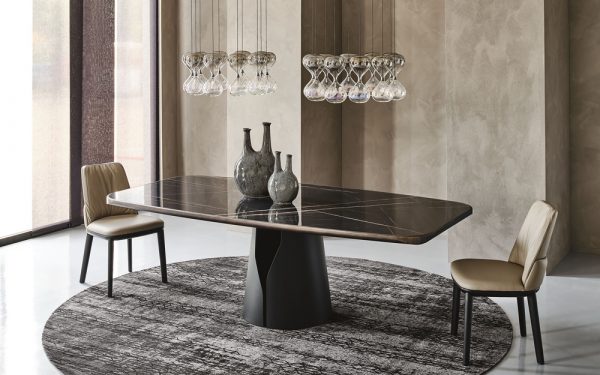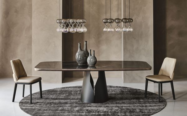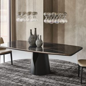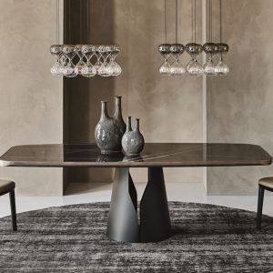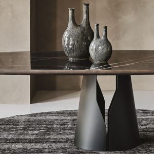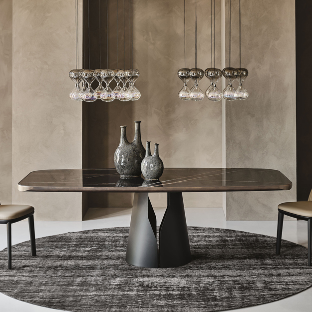 The Cattelan Italia Giano Keramik Premium Table features a statement central rounded base with a stylised split design, allowing the eye to see through from one side to the other. The unique base comes in a choice of embossed lacquered steel finishes.