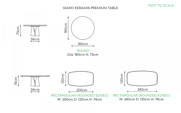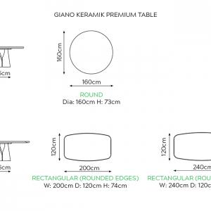 Size | Rectangular (Rounded Edges) – W: 200cm D: 120cm H: 74cm, Rectangular (Rounded Edges) – W: 240cm D: 120cm H: 74cm, Round – Dia: 160cm H: 73cm |