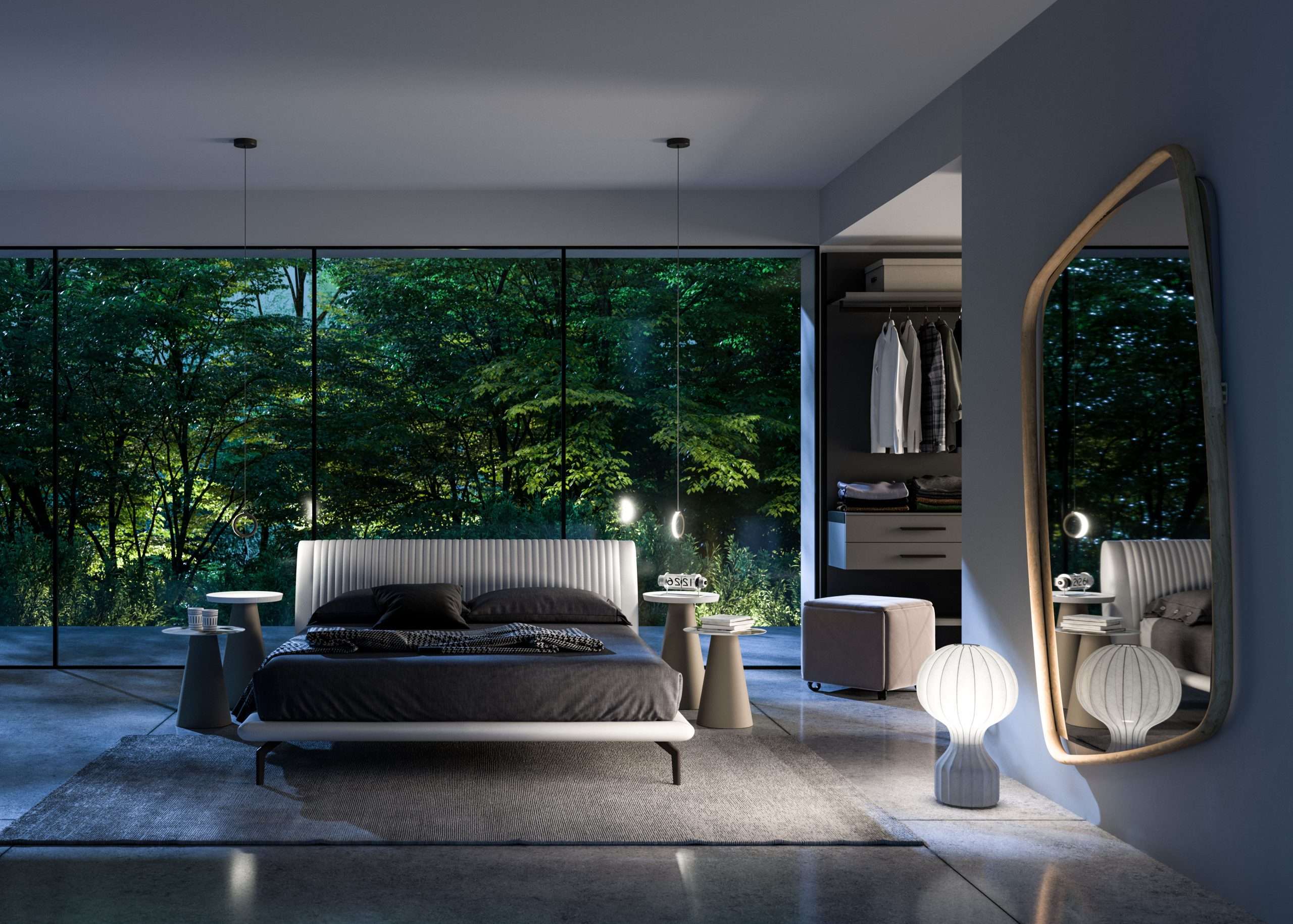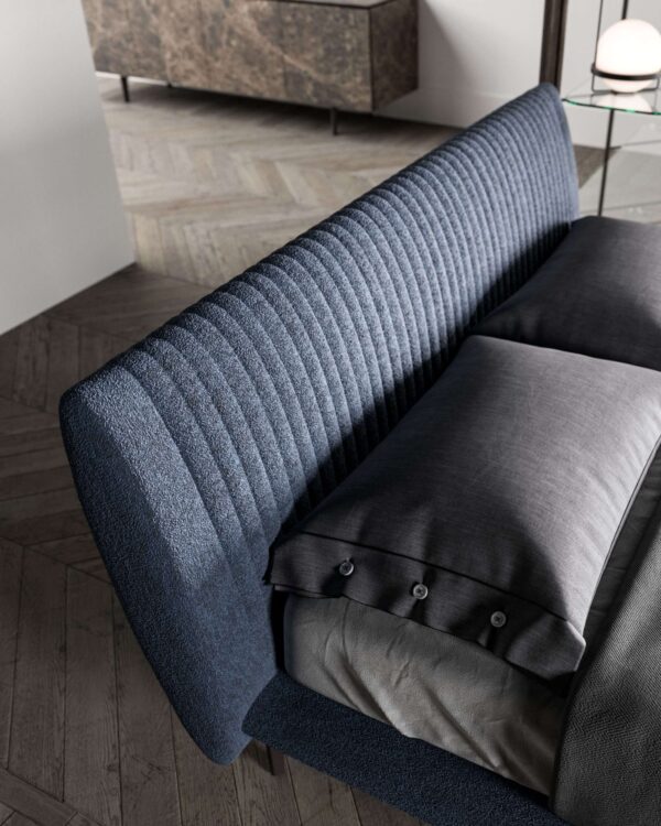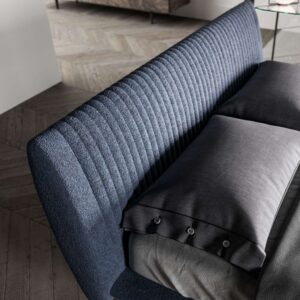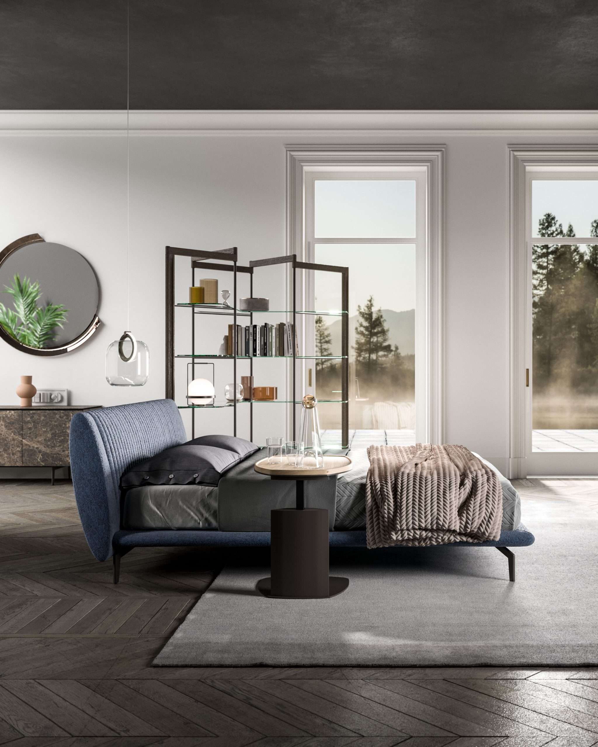 A nostalgic leap into the past with a textile bed with an informal and comfortable style. A slim profile and a headboard with delicate stitching that, creating a slight bulge, enhance its softness. An ideal design complement to place in the center of the room thanks to its unmistakable tailoring craftsmanship.