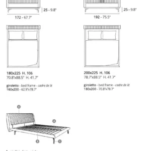 Bed with upholstered headboard and bed frame covered in various finishes. Bed available in sizes 160 and 180, multilayer wooden slatted base. Metal feet and bed frame with removable cover.