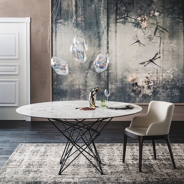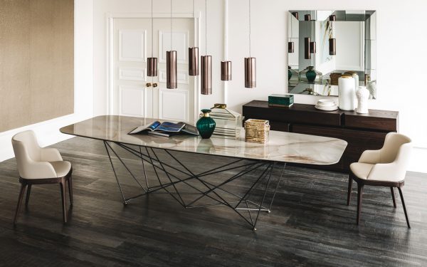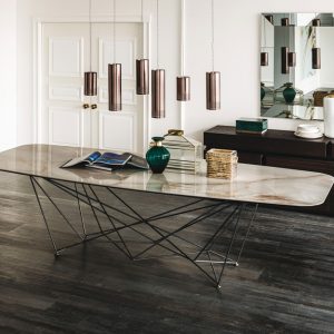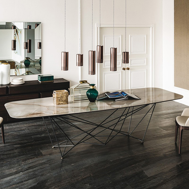The elegant Gordon Keramik Table by Cattelan Italia features a distinctive lacquered steel frame comprising a geometric web of ‘ropes’ interlinked in symmetrical formation.