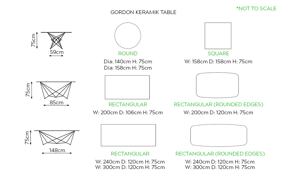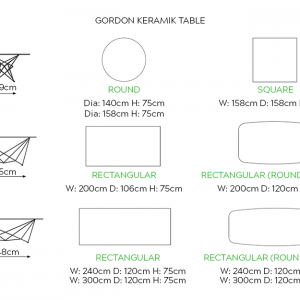| Size | Rectangular – W: 200cm D: 106cm H: 75cm, Rectangular – W: 240cm D: 120cm H: 75cm, Rectangular – W: 300cm D: 120cm H: 75cm, Rectangular (Rounded Edges) – W: 200cm D: 120cm H: 75cm, Rectangular (Rounded Edges) – W: 240cm D: 120cm H: 75cm, Round – Dia: 140cm H: 75cm, Round – Dia: 158cm H: 75cm, Square – W: 158cm D: 158cm H: 75cm |