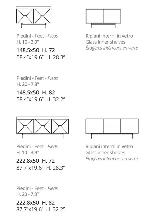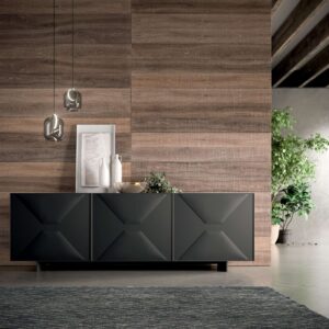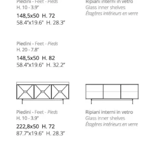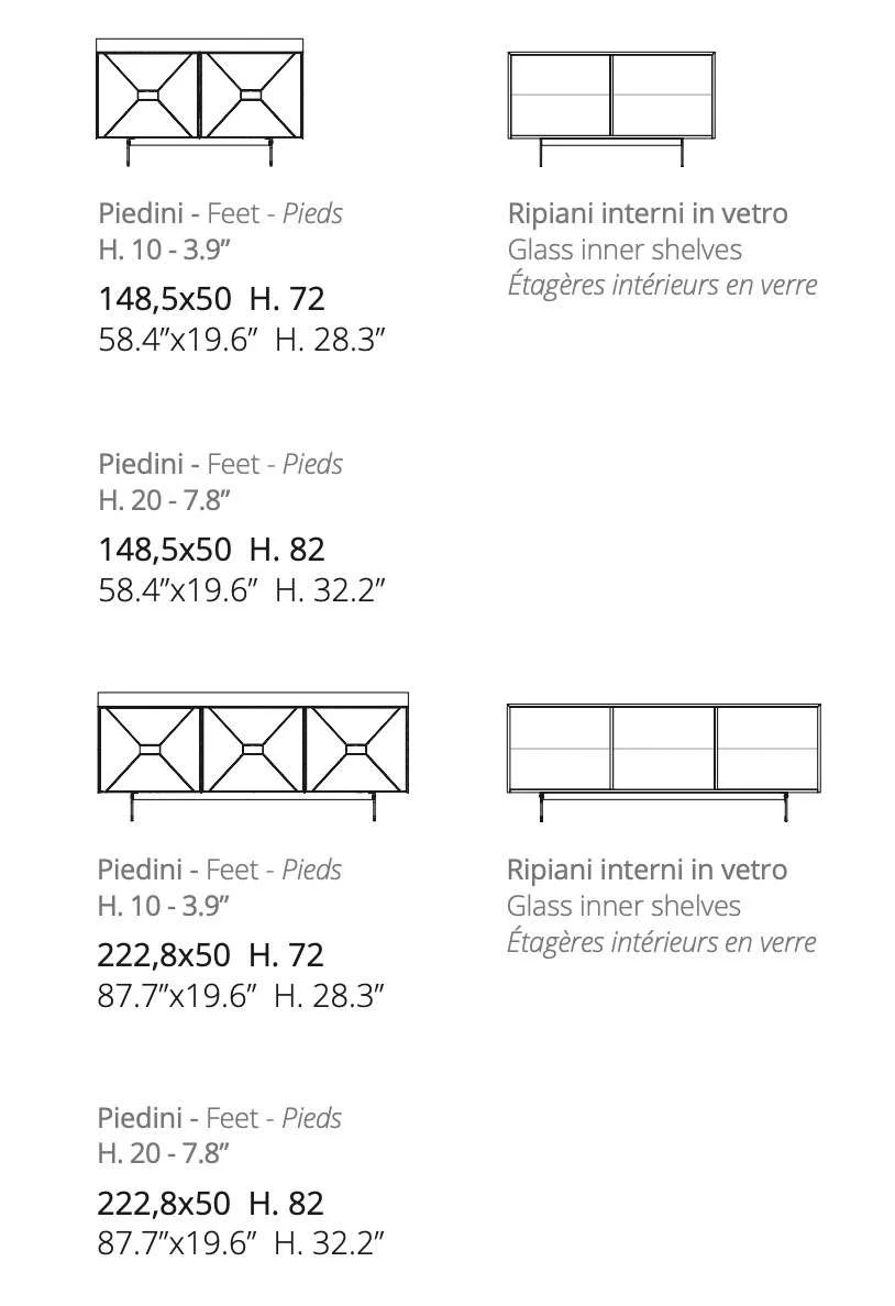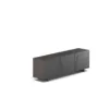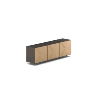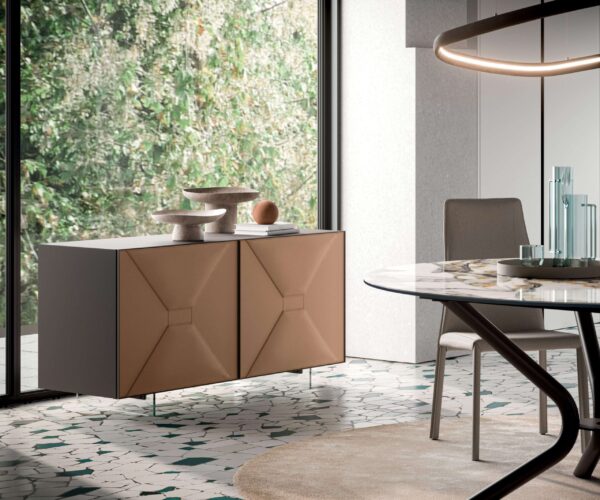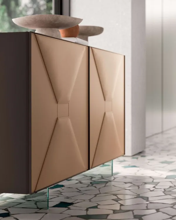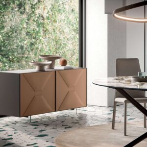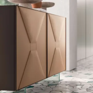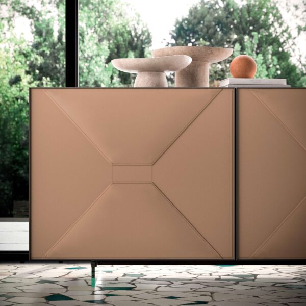 Sideboard with lacquered container, leather doors with matching stitching, aluminium frame. Glass or metal feet, available in two heights.