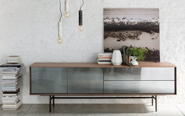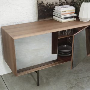 The Harald is a contemporary sideboard composed of a solid Canaletto Walnut frame on slender Bronzoro metal legs. The front panels can be selected in a matching Canaletto Walnut or contrasting Smoked Mirror finish for a subtle industrial essence.