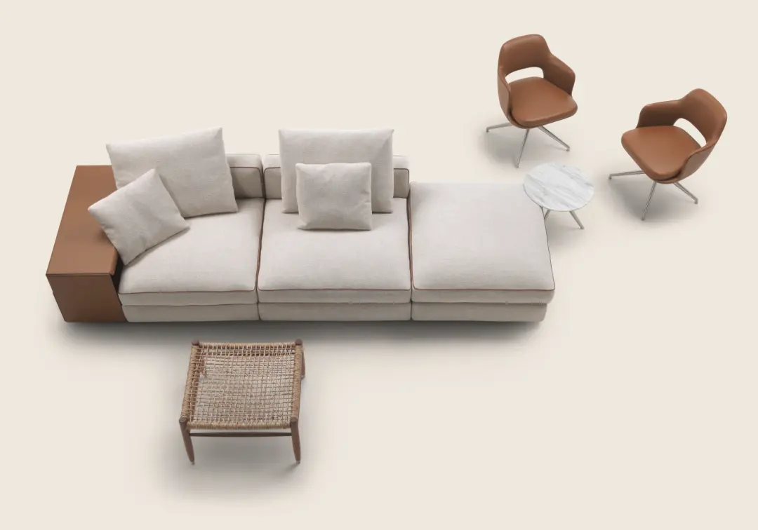 The Harper seating system has an innately elegant appeal, thanks to its balanced proportions, couture tailoring of the upholstery and exquisite handcrafted details. The Harper sofa comes in three depths – 99 cm, 111 cm and 126 cm – and the numerous available elements, as well as the countless combinations that can be created between fabric and leather upholstery and cowhide . All these Designs are Fully Bespoke . Our Expert Team can create any Design as per your specifications and requirements. For More information please contact our expert.