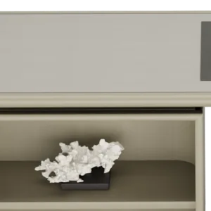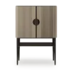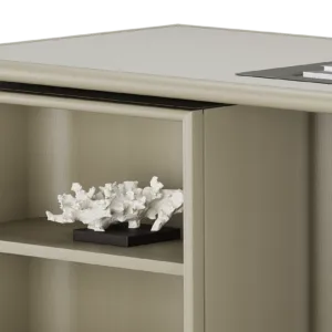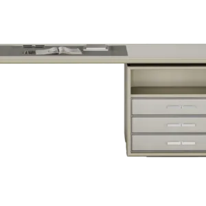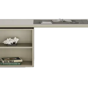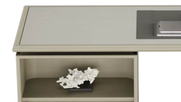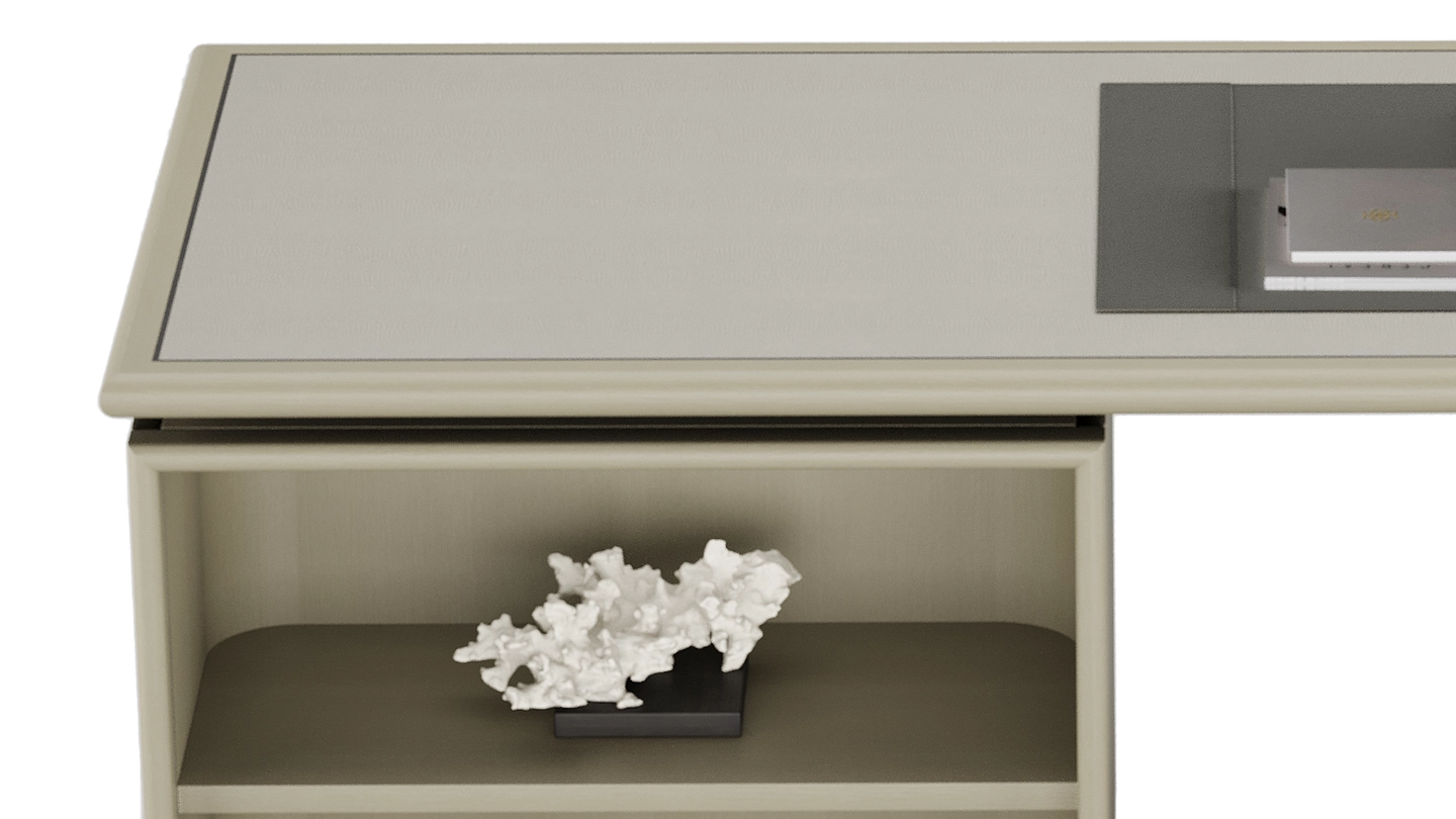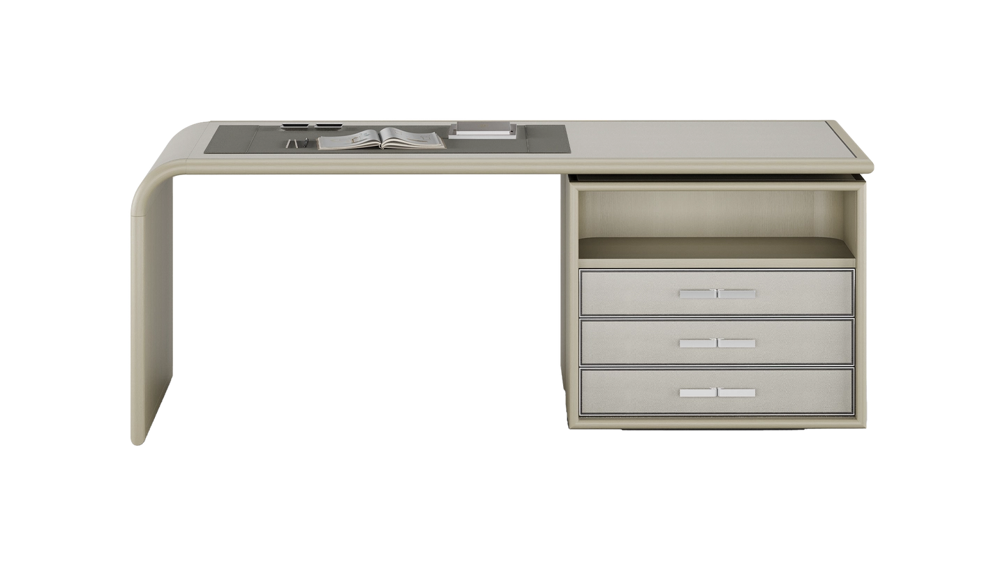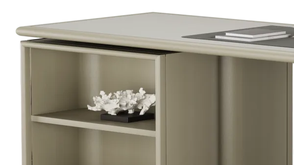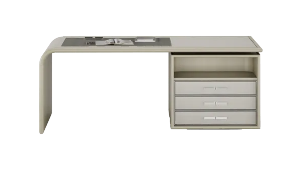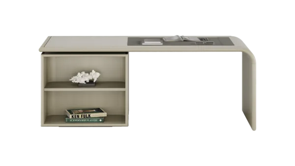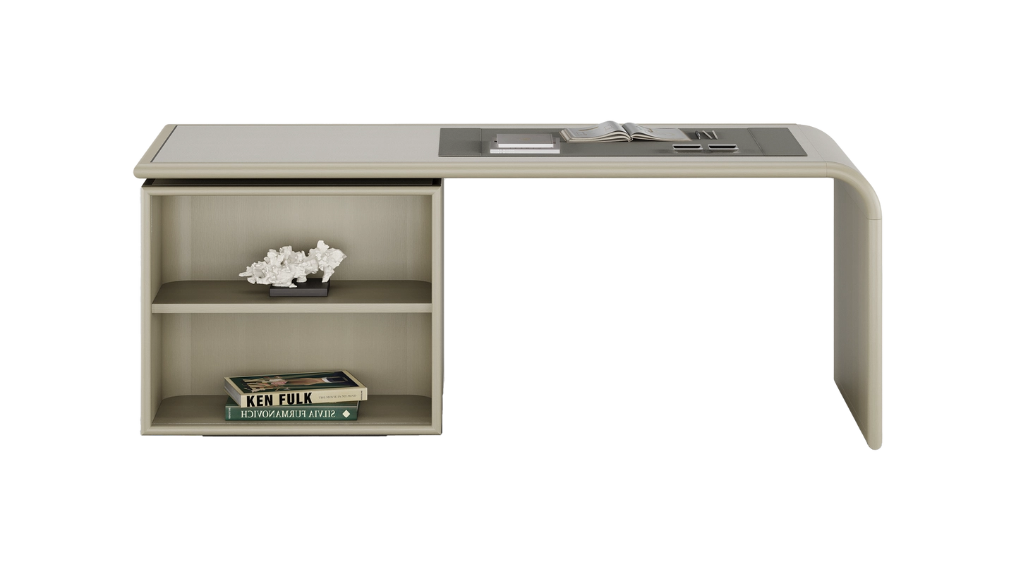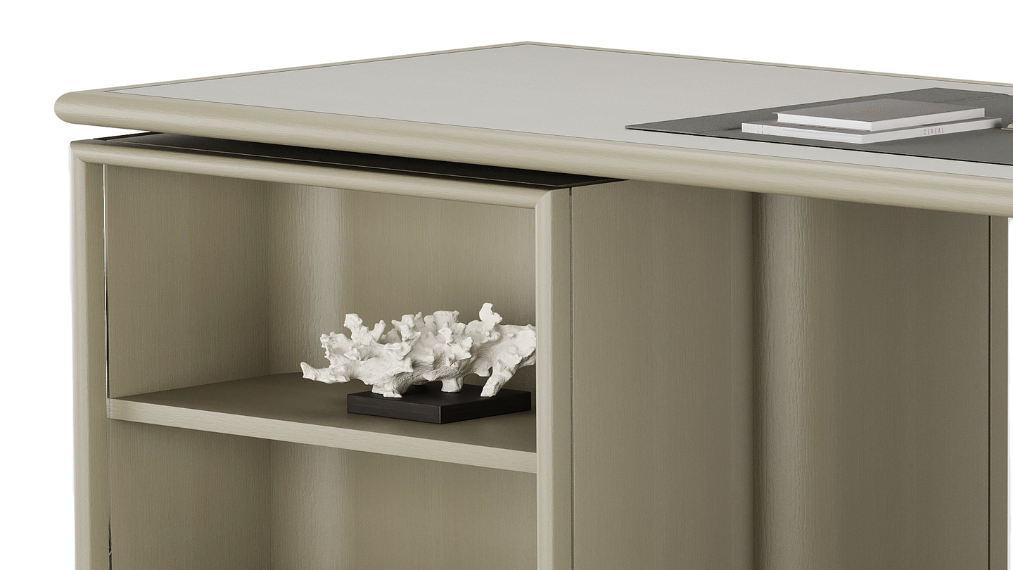 Vintage meets modern in our HATTA Desk, which combines a smooth curved shape with practical shelving. It’s crafted from satin open-pore wood and features leather, suede and stainless steel details.