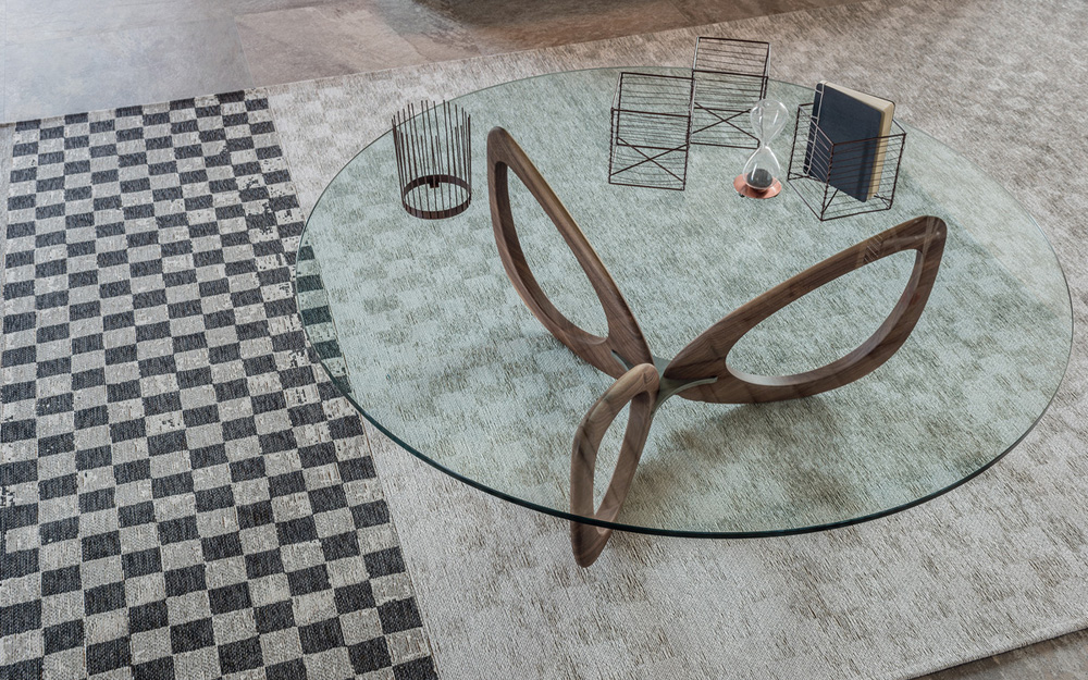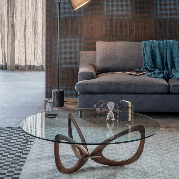The Helix Coffee table features an elegantly sculpted base consisting of three or four curved base sections in Canaletto Walnut, connected centrally by a varnished Steel frame. The top is available in various round, square or rectangular sizes in transparent clear glass.