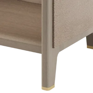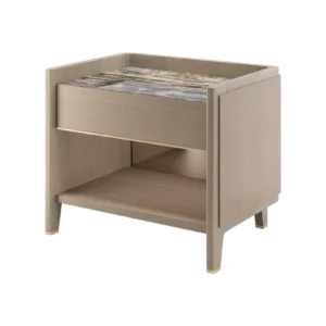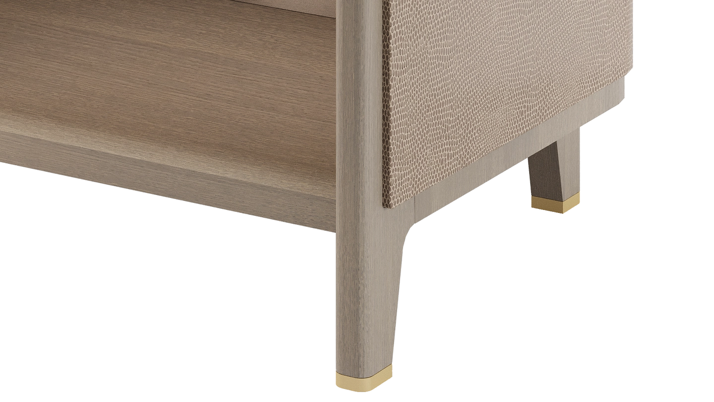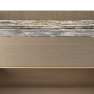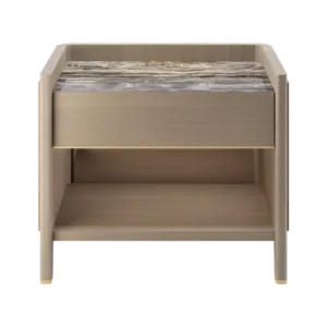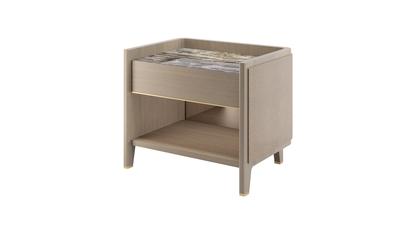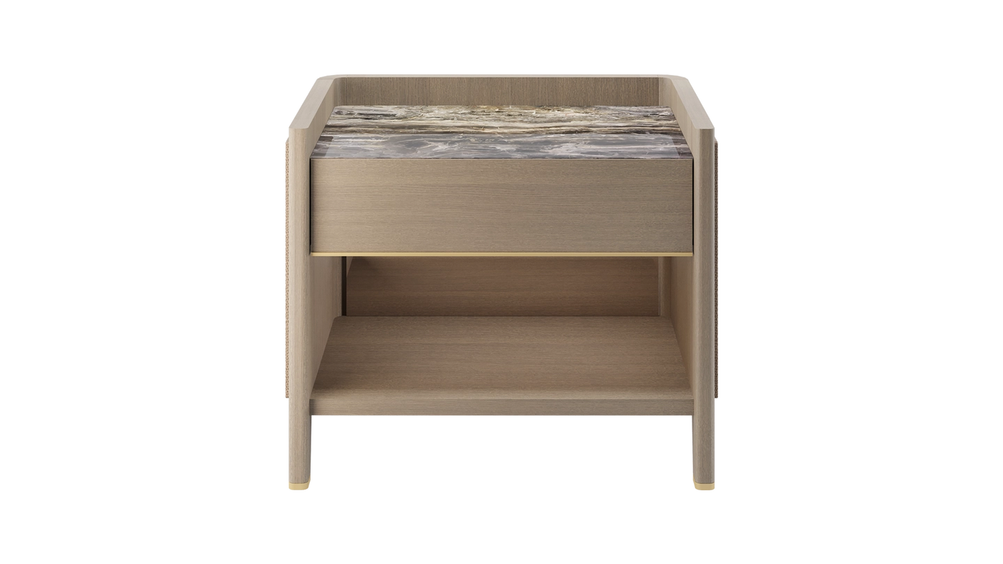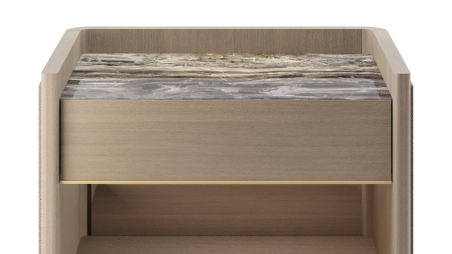 A smooth stone surface, wraparound leather panel and reflective bronze mirror interior add unexpected layers to the HVAR bedside table’s minimalist lines.