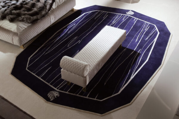 Upholstered bench with Giorgio Collection logo available in first grade leather, nubuk leather, lizard printed leather, velvet or suede fabric. Base in light gold chrome stainless steel.