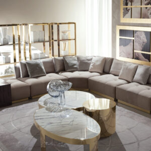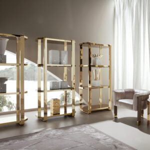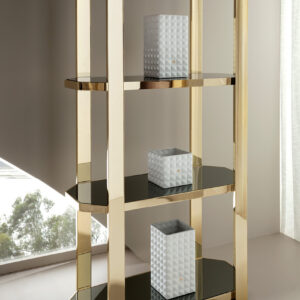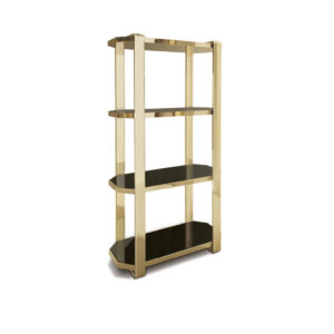 Bookcase in light gold chrome stainless steel with Giorgio Collection logo. 3 tempered dark mirror glass shelves.