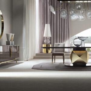 Buffet with 4 inlaid doors in makorè mahogany veneer with high gloss polyester finish.Top with insert in light gold chrome stainless steel. Base and 2 center handles in light gold chrome stainless steel with Giorgio Collection logo. 2 lateral doors with push up opening.