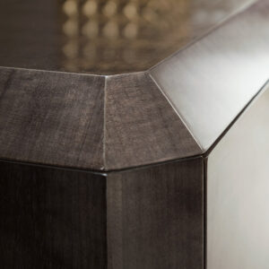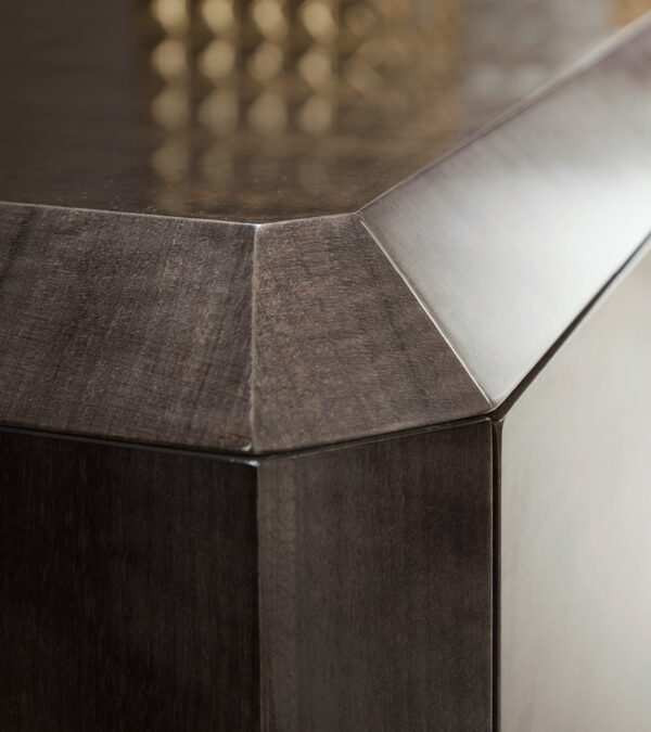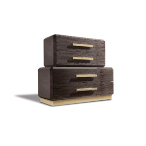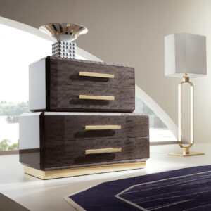 2 steps low chest with Giorgio Collection logo 4 full extension drawers with bottom part in velvet fabric. Base and handles in light gold chrome stainless steel with Giorgio Collection logo.
