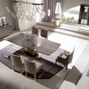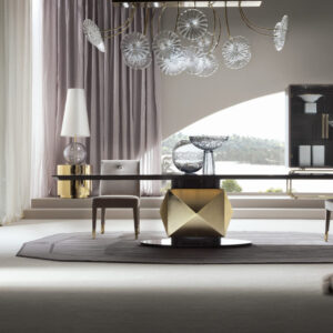 Fully upholstered side chair. Back with Giorgio Collection logo. 4 legs in light gold chrome stainless steel.