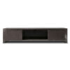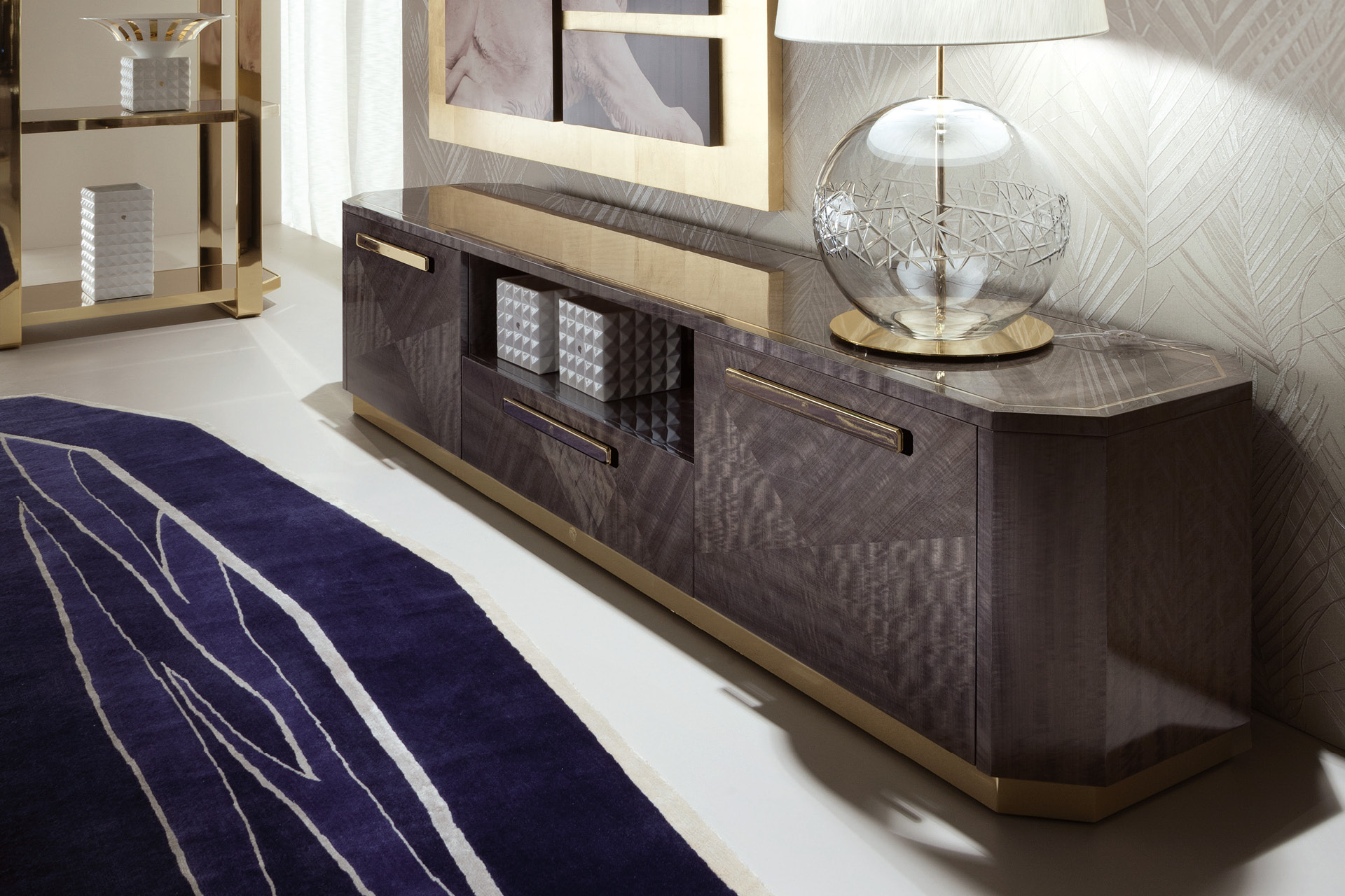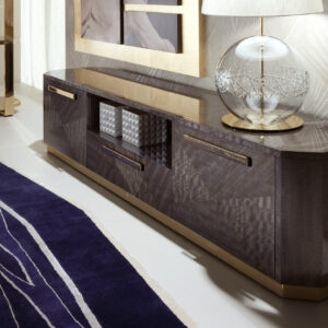 Base for T.V. unit in makorè mahogany veneer with high gloss polyester finish. Top with insert in light gold chrome stainless steel. 2 doors and 1 center full extension drawer w/bottom part in velvet fabric, 1 center open space. Base and handles in light gold chrome stainless steel.