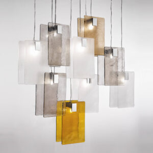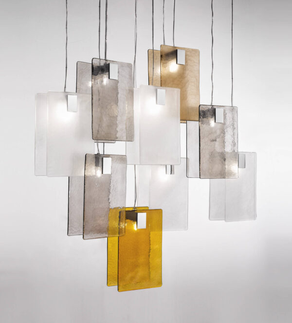 Pendant in cast glass with metal details in chrome finish. Available in different colours.