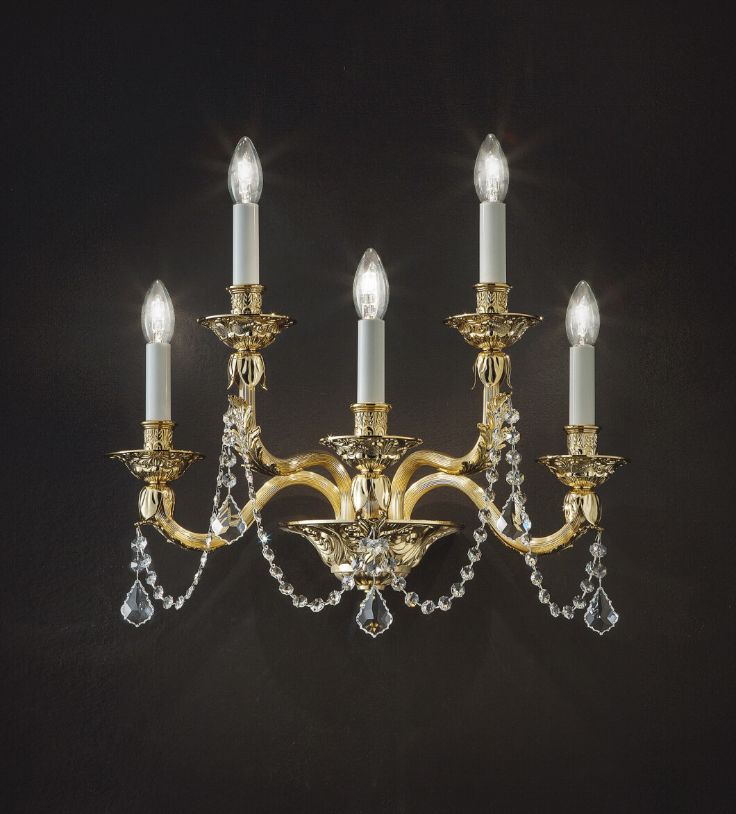 Wall lamp in metal with gold finish, crystal pendants. Available in different dimensions.