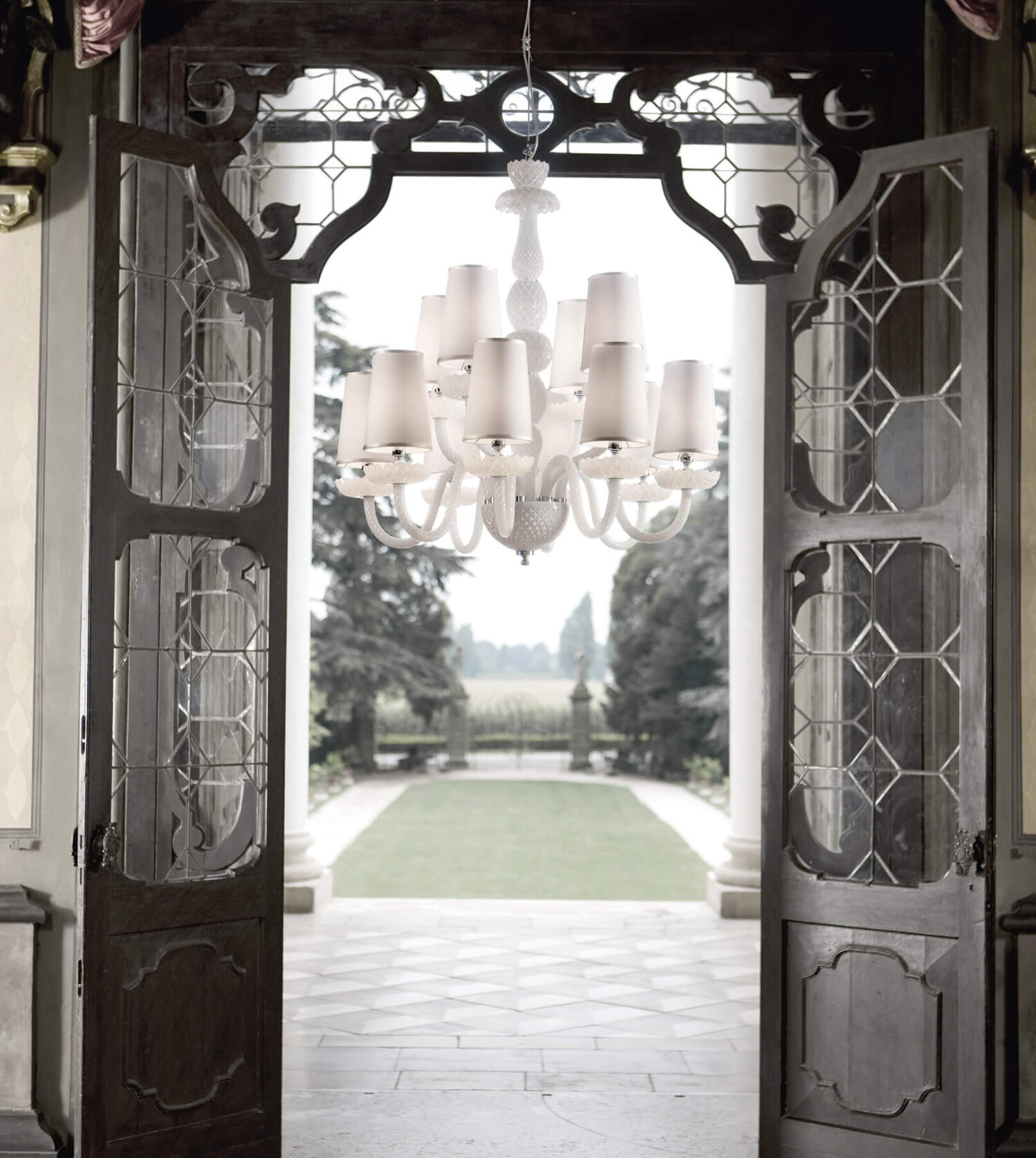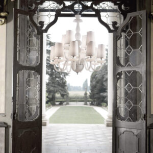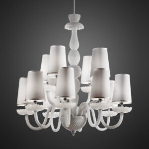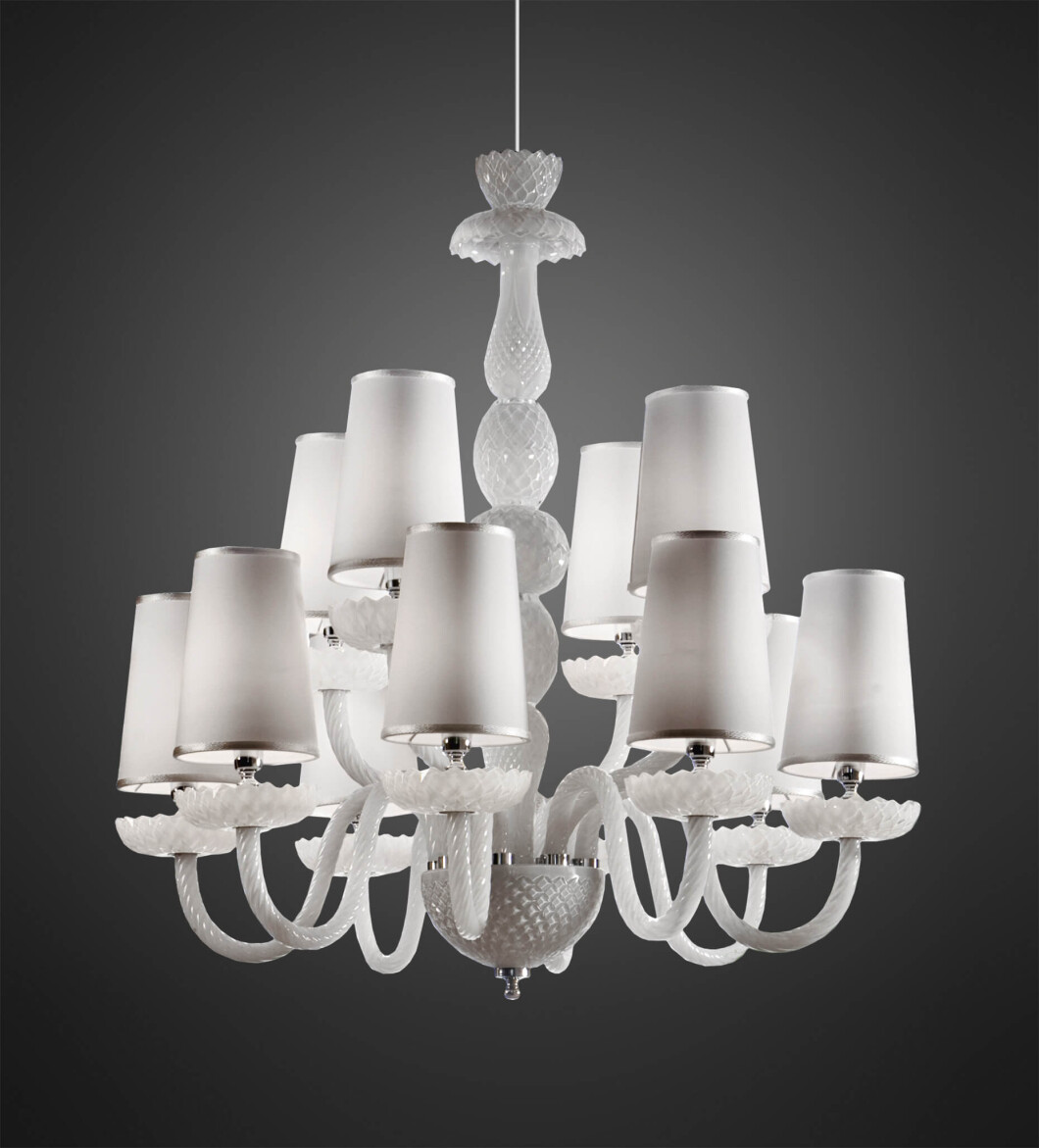 Chandelier in white carved crystal, metal with nickel finish, ivory fabric shades. Available in different dimensions and colours.