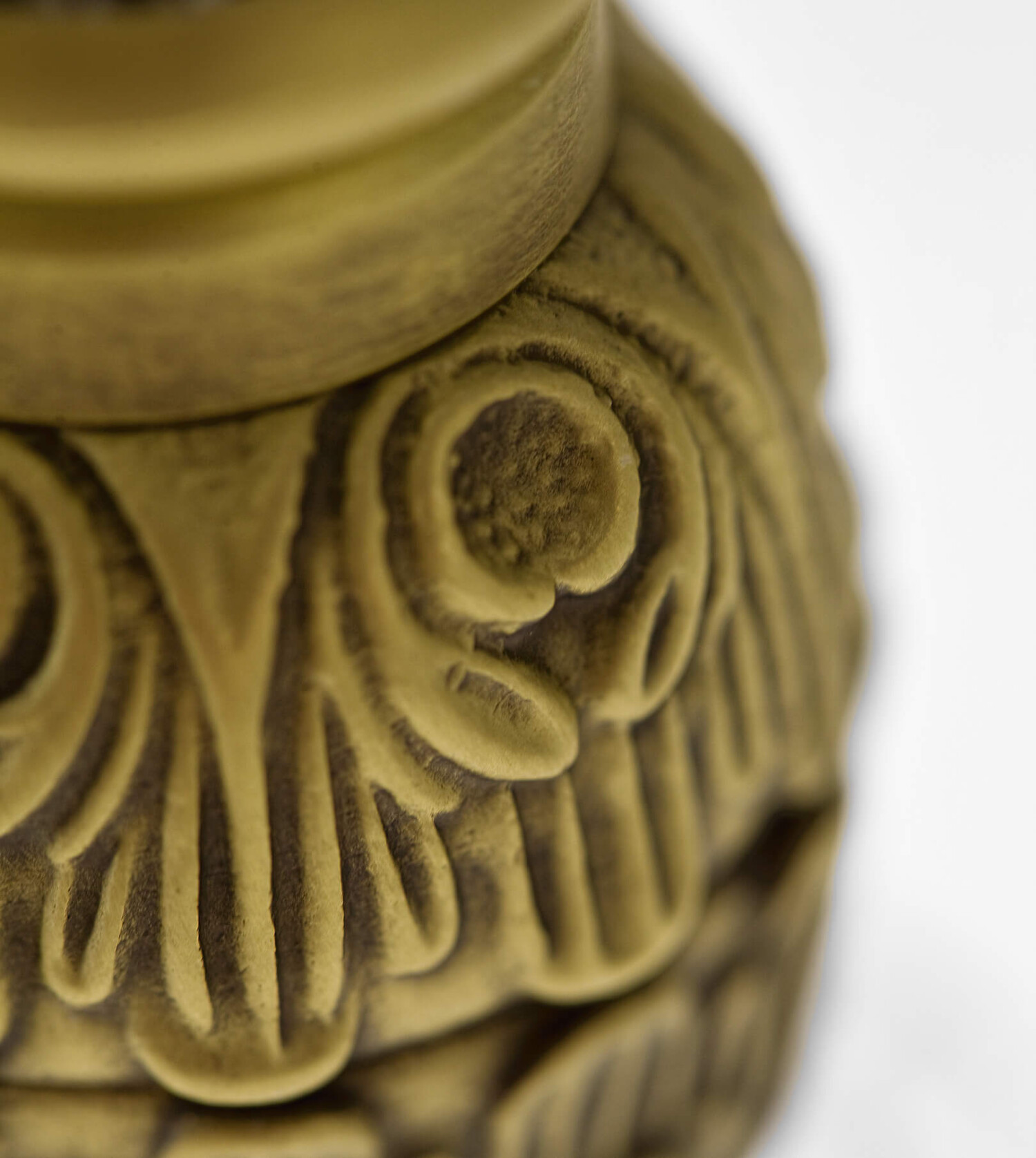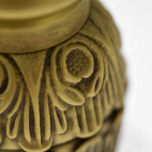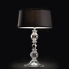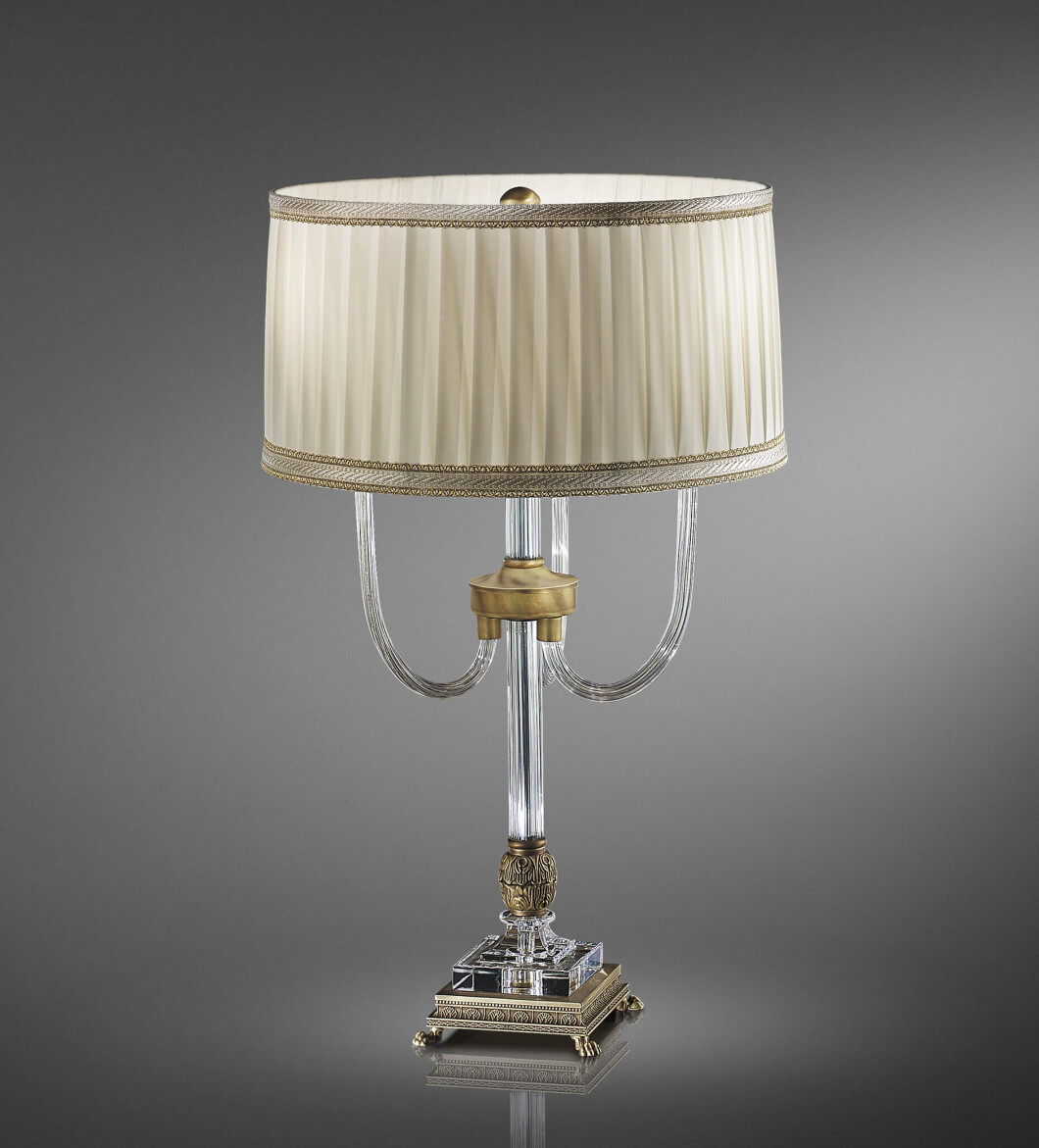 Table lamp in ruled glass and crystal and antique gold metal base and details. Ivory plissé fabric shade. Available in different dimensions and colours.