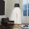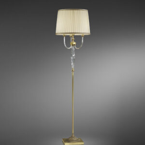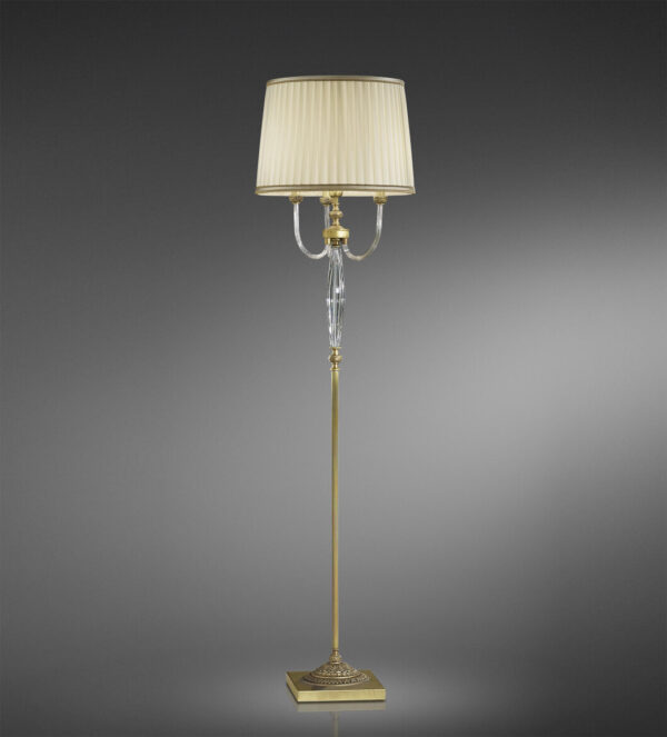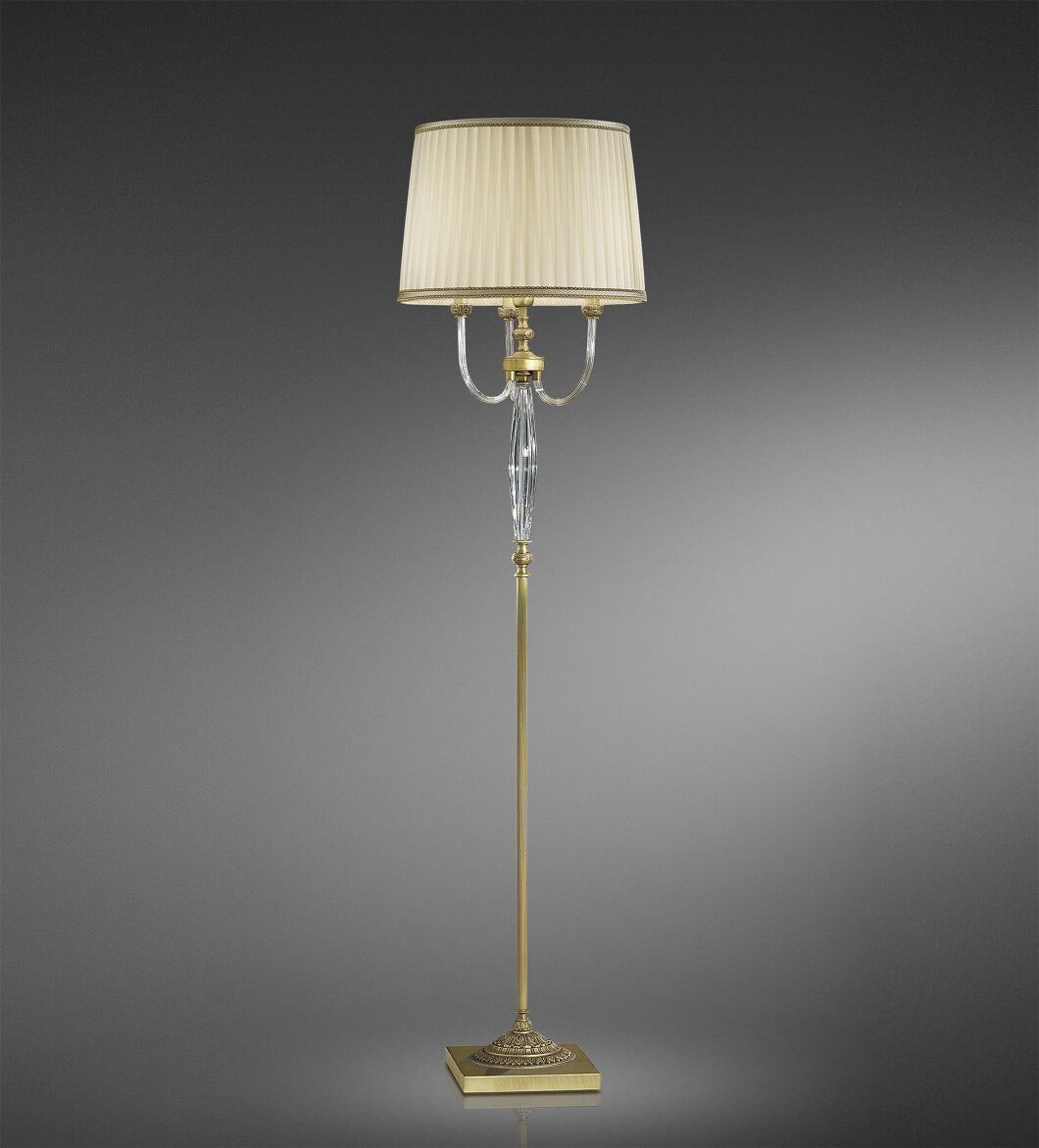 Floor lamps in ruled glass and crystal and antique gold metal base and details. Ivory plissé fabric shade. Available in different dimensions and colours.