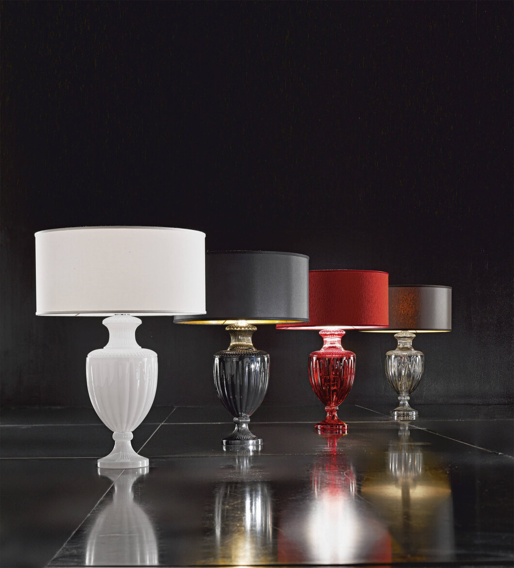 Table lamp in carved crystal available in white, black, red and teak colours, with fabric shade colour matching the base.