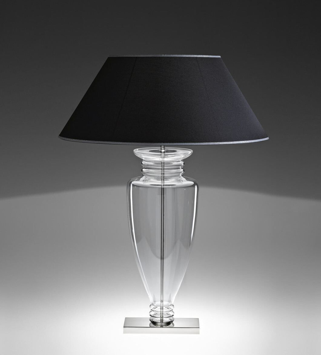 Table lamp in blown glass with metal base in nickel finish. Black fabric shade.