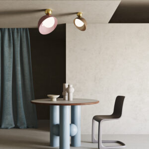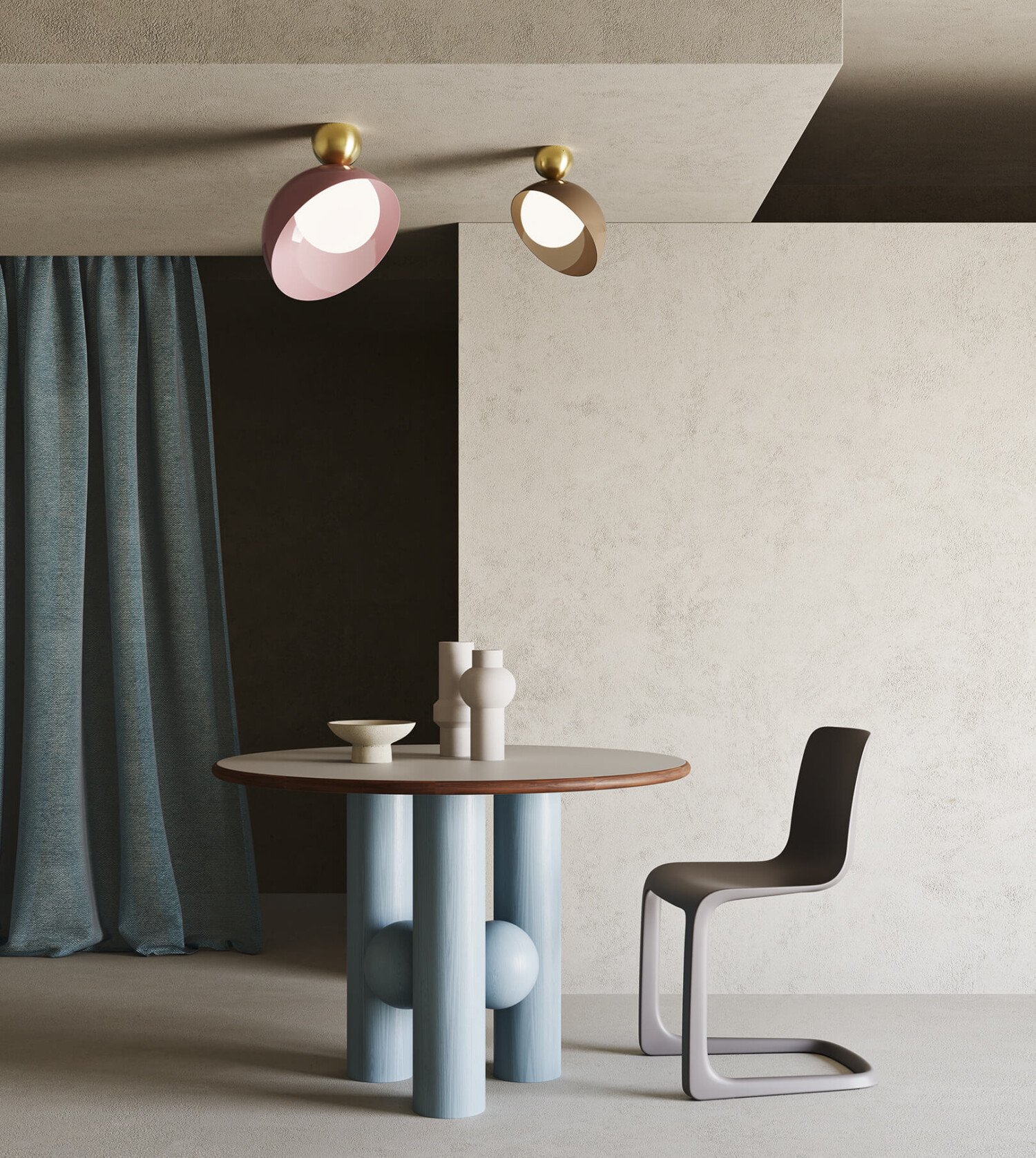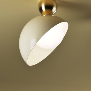 Ceiling lamp with structure and decorative parts in metal available in Ancient White, Yellow Sunrise, Baby Blue, Baby Pink and Cappuccino. Middle sphere with brushed light gold finish. Diffuser in white glass.