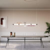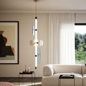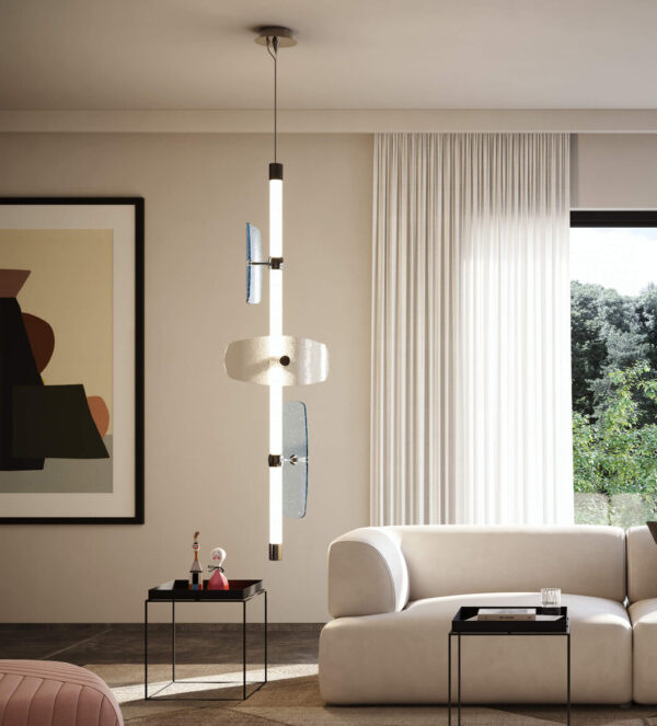 Axi is a chandelier with a ‘retro-futurist’ aesthetic, composed of a tubular structure in white borosilicate glass containing an LED light source, interspersed with metal elements from which extend arms onto which coloured art glass panels are fixed, gravitating around the central element. These elements have a curved and textured surface, which filters the light with plays of transparency and refraction.