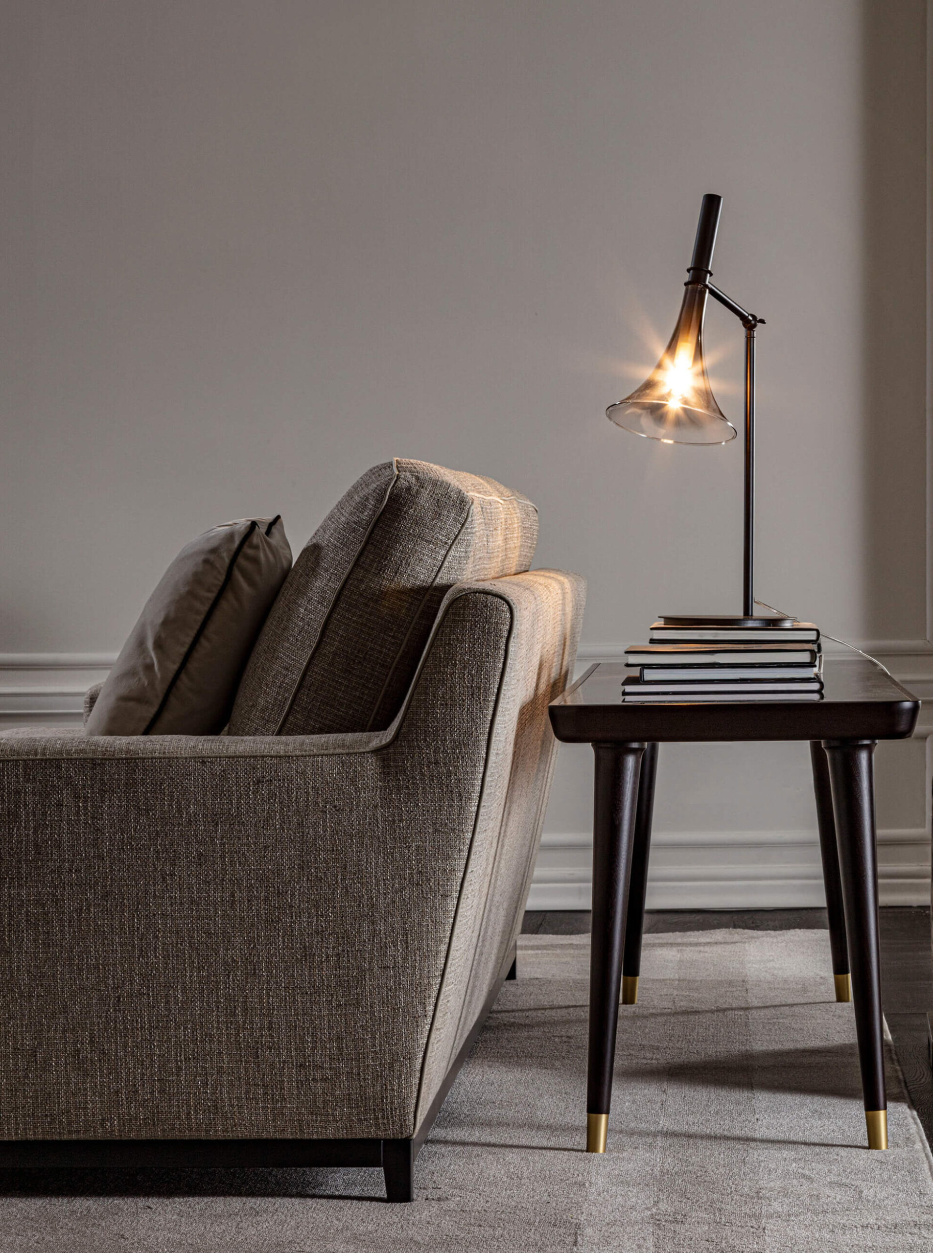 Table lamps with transparent glass shaded in titanium, gold or white colour. Metal structure matching with the glass colour.