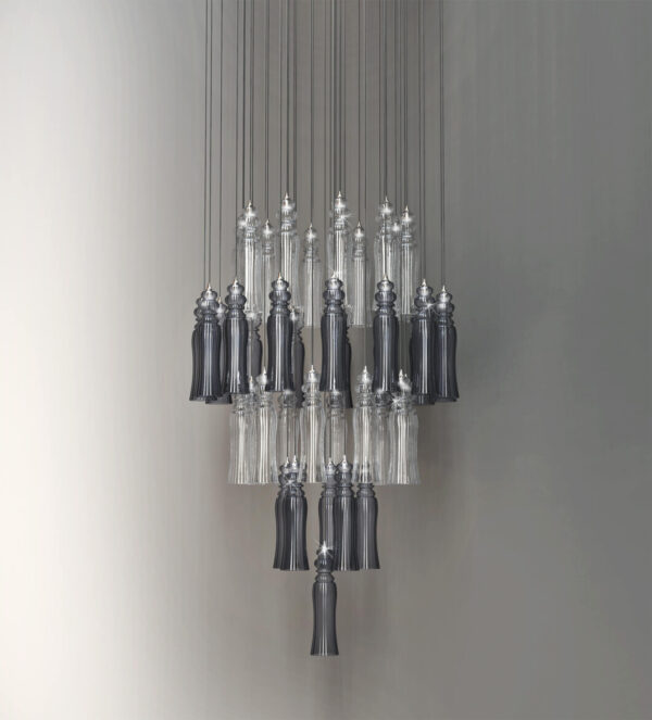 Pendant composed of blown ruled glass diffusers in transparent and blue fumè colours. Metal structure with chrome finish.