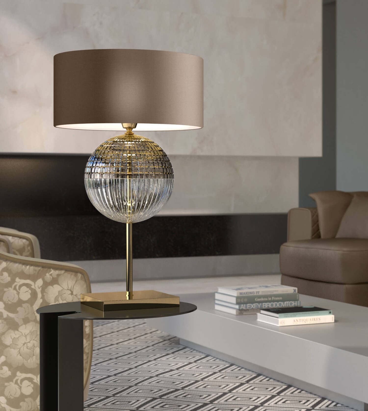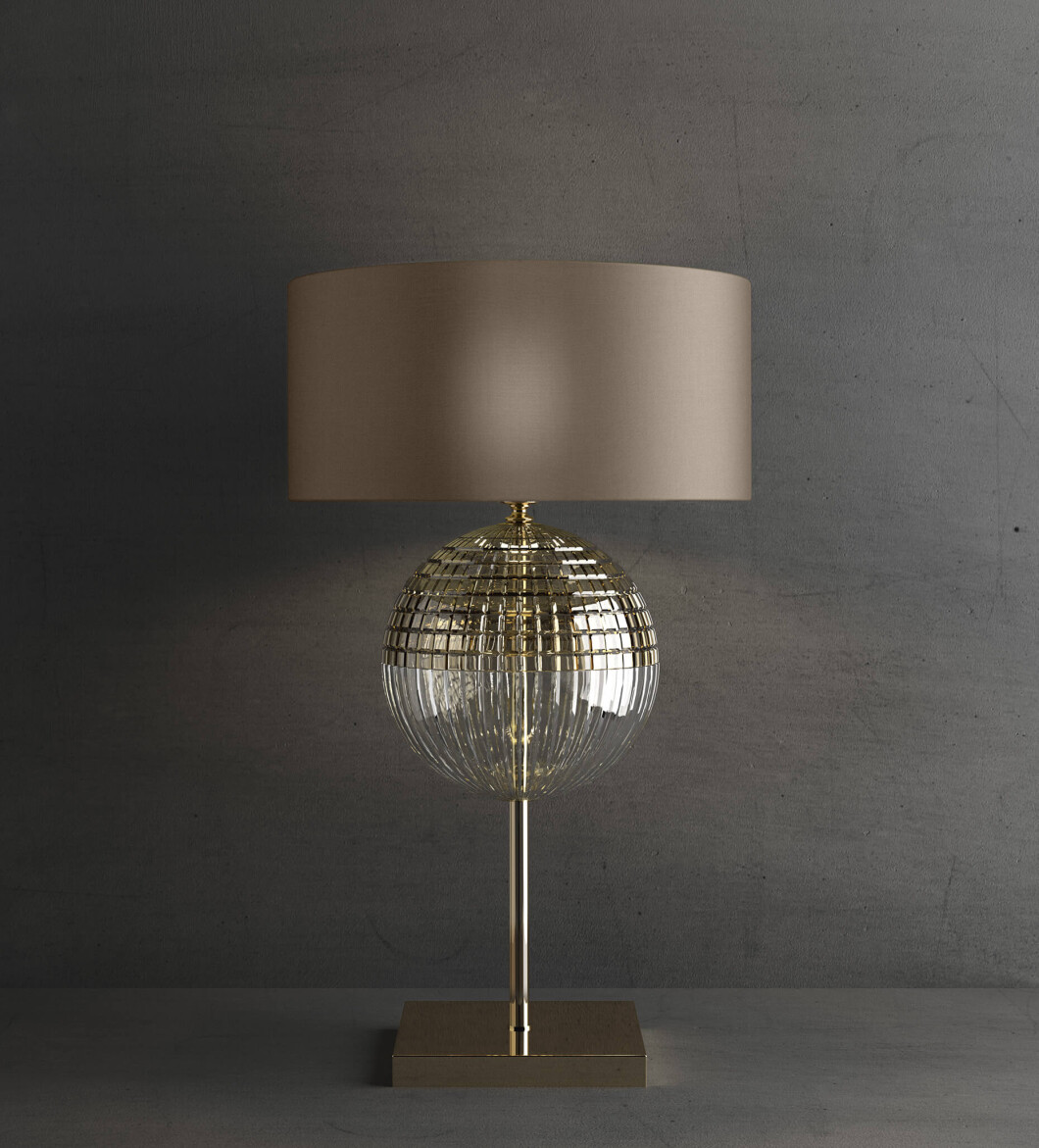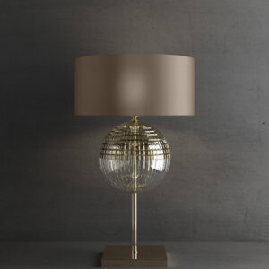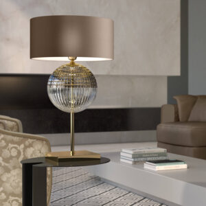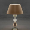 Table lamp in metal with gold nickel finish, carved clear and teak crystal and dove colour fabric shade. Available in different colours.