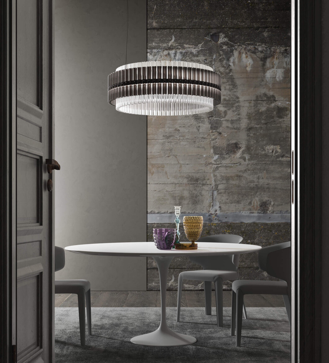 Pendant lamp composed by transparent and teak glasses with chrome metal finish.